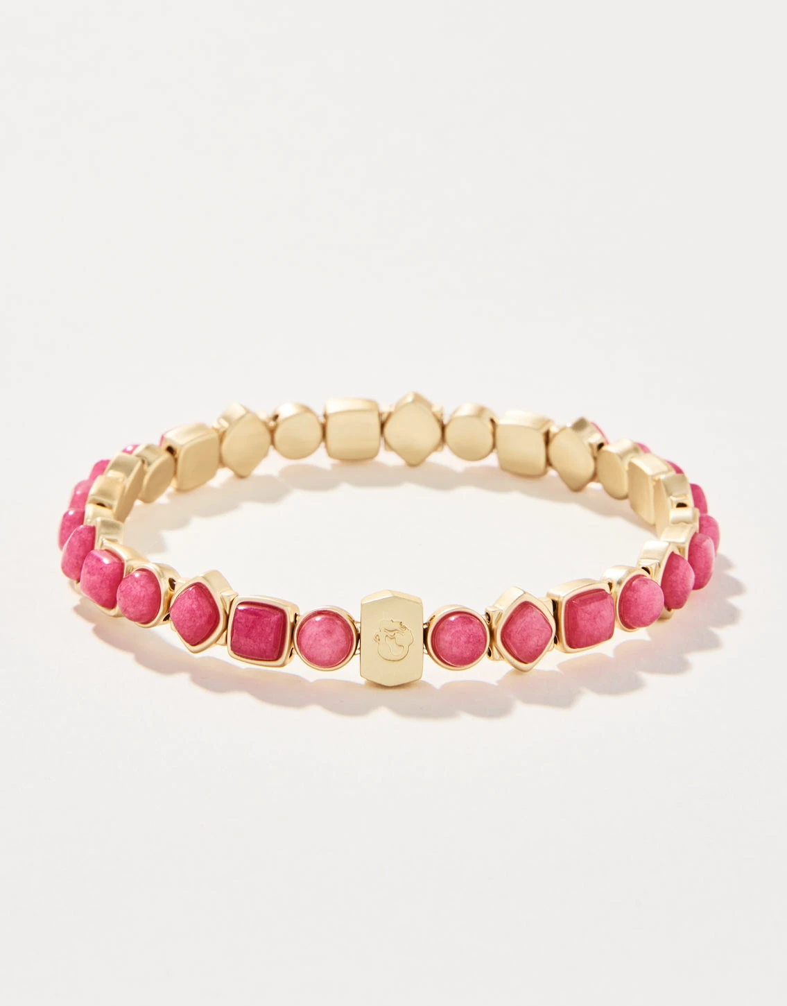 Your Lowcountry style shines through our Maera Stretch Bracelet in 18KT matte gold plating with pink dyed jade stone inlays. Stacks beautifully with our other Meara Stretch Bracelets.