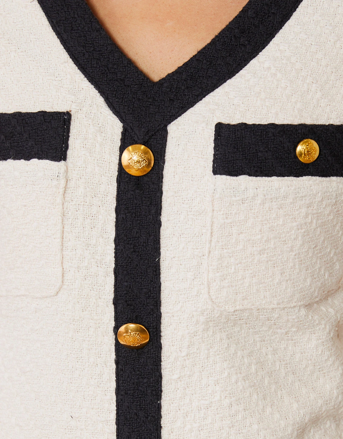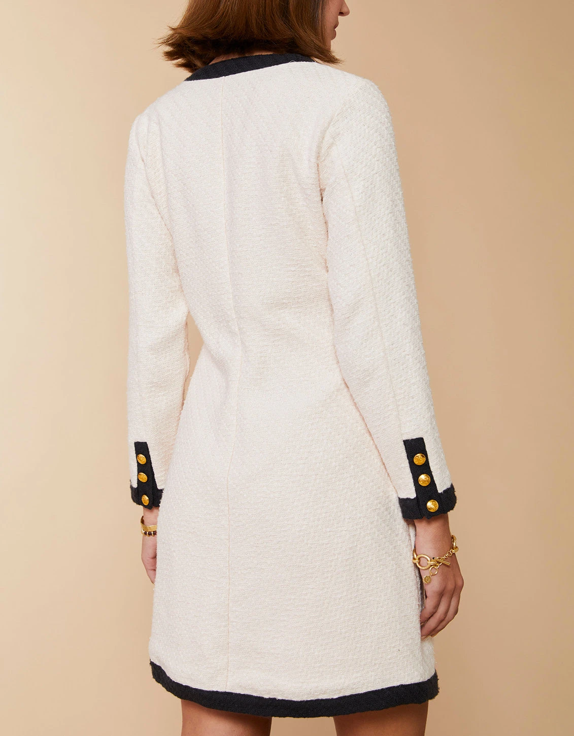 A classic look in soft, comfortable 100% cotton made to last, our Maggie Tweed Dress features a V-neckline, contrast edging, front patch pockets, bracelet length sleeves, and gold novelty summarys. Wear with flats to work or with heels to an evening out to complement this luxurious dress.