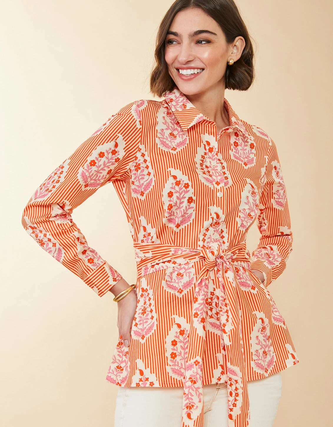 Our best-selling dress is now in a blouse! You’ll never have to sacrifice style for comfort in our soft but structured stretch cotton Marianne Blouse. This long sleeve blouse will be your new wardrobe favorite with faux pearl summarys, a collared neckline, and a tie waist belt.