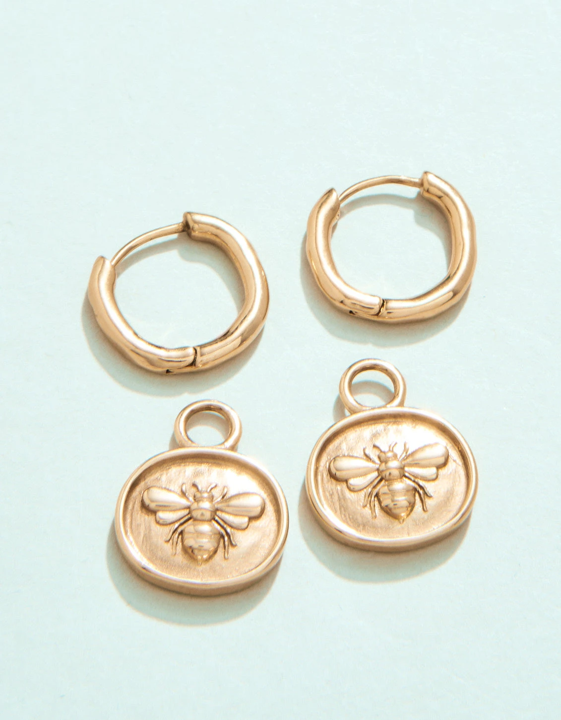 Made of tarnish free, water resistant 14kt shiny gold plating over stainless steel, these Mason Bee Convertible Hoop Earrings feature a warm, golden coin pendant with an embossed bee icon. These are earrings you will never have to take off, designed to shine through everyday wear, exercise, showers and a summer at the beach. Bonus, remove the drop for a simple gold hoop. 2-looks-in-1!