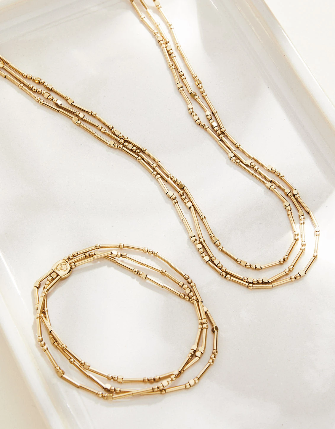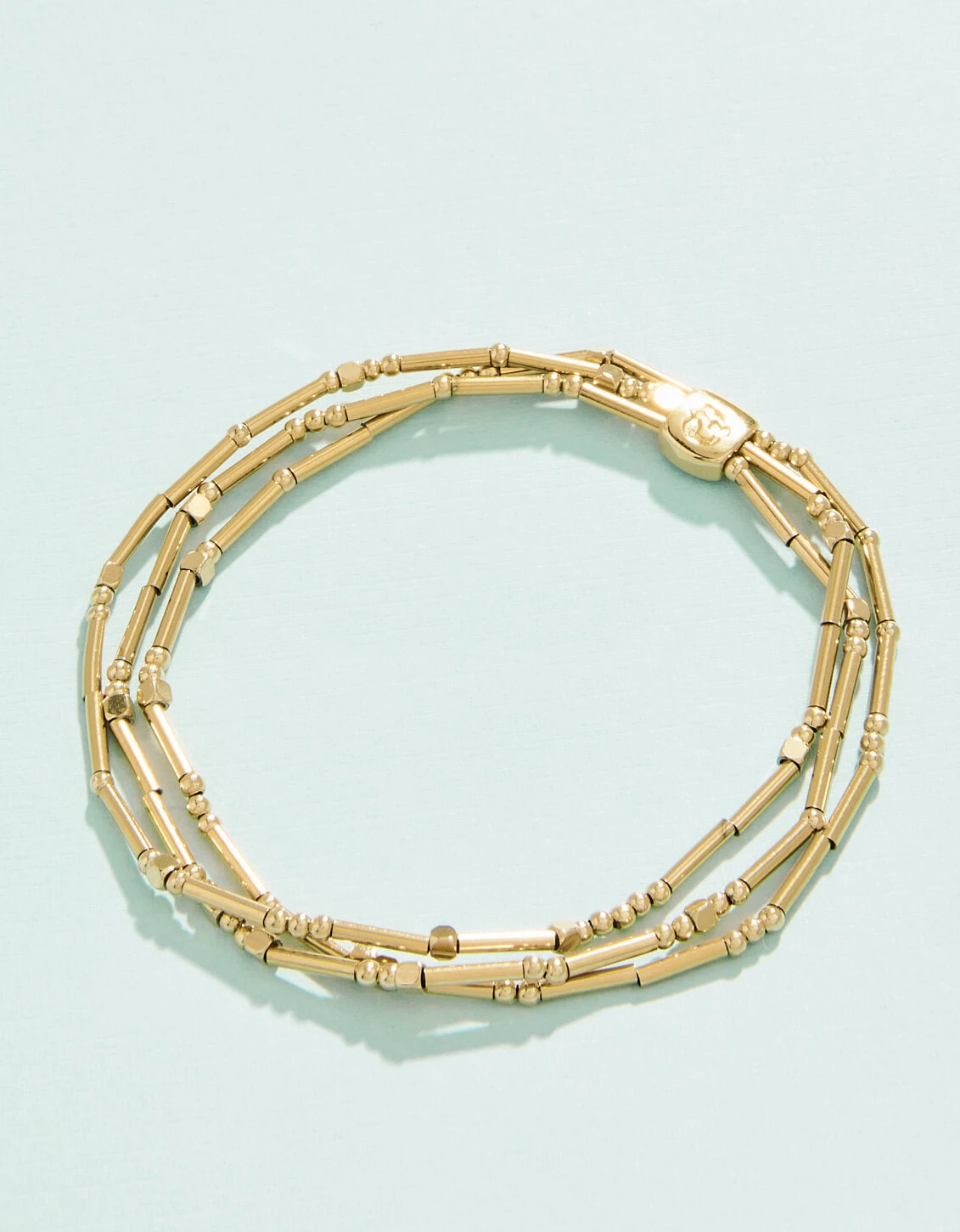 You will be enchanted by three layers of mermazing tiny metal beads in this easy-on stretch bracelet. Designed to shine through everyday wear, exercise, showers and a summer at the beach in tarnish free 14kt gold vacuum plating.