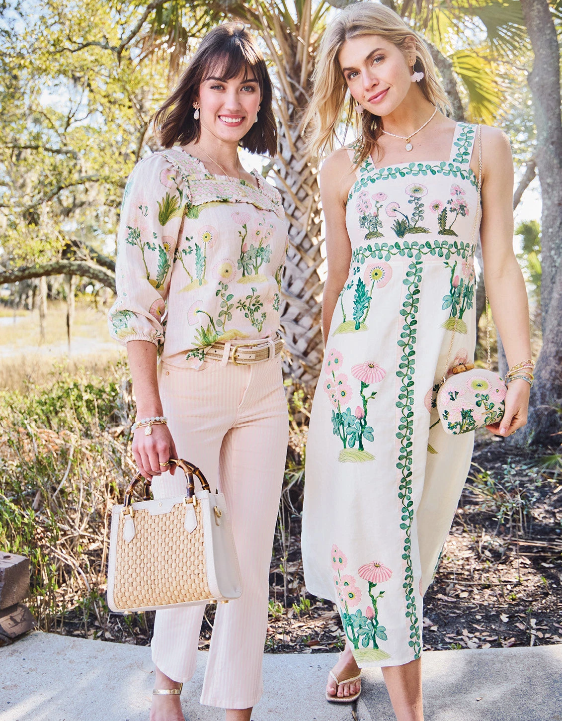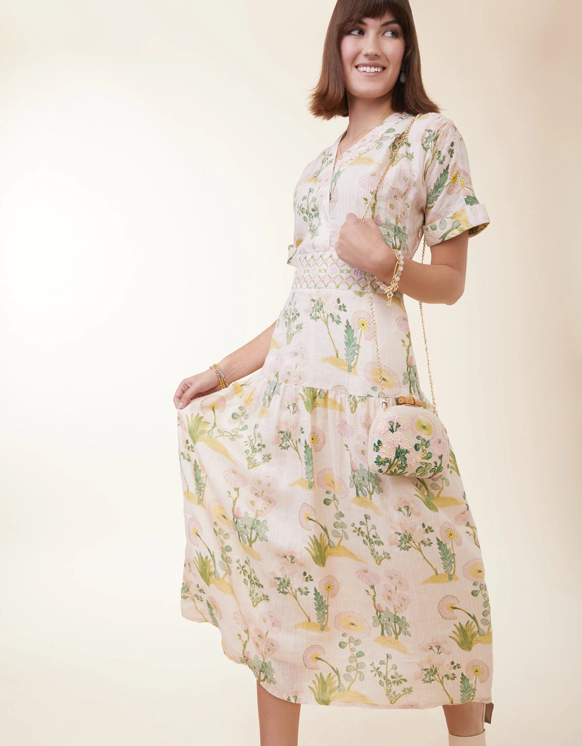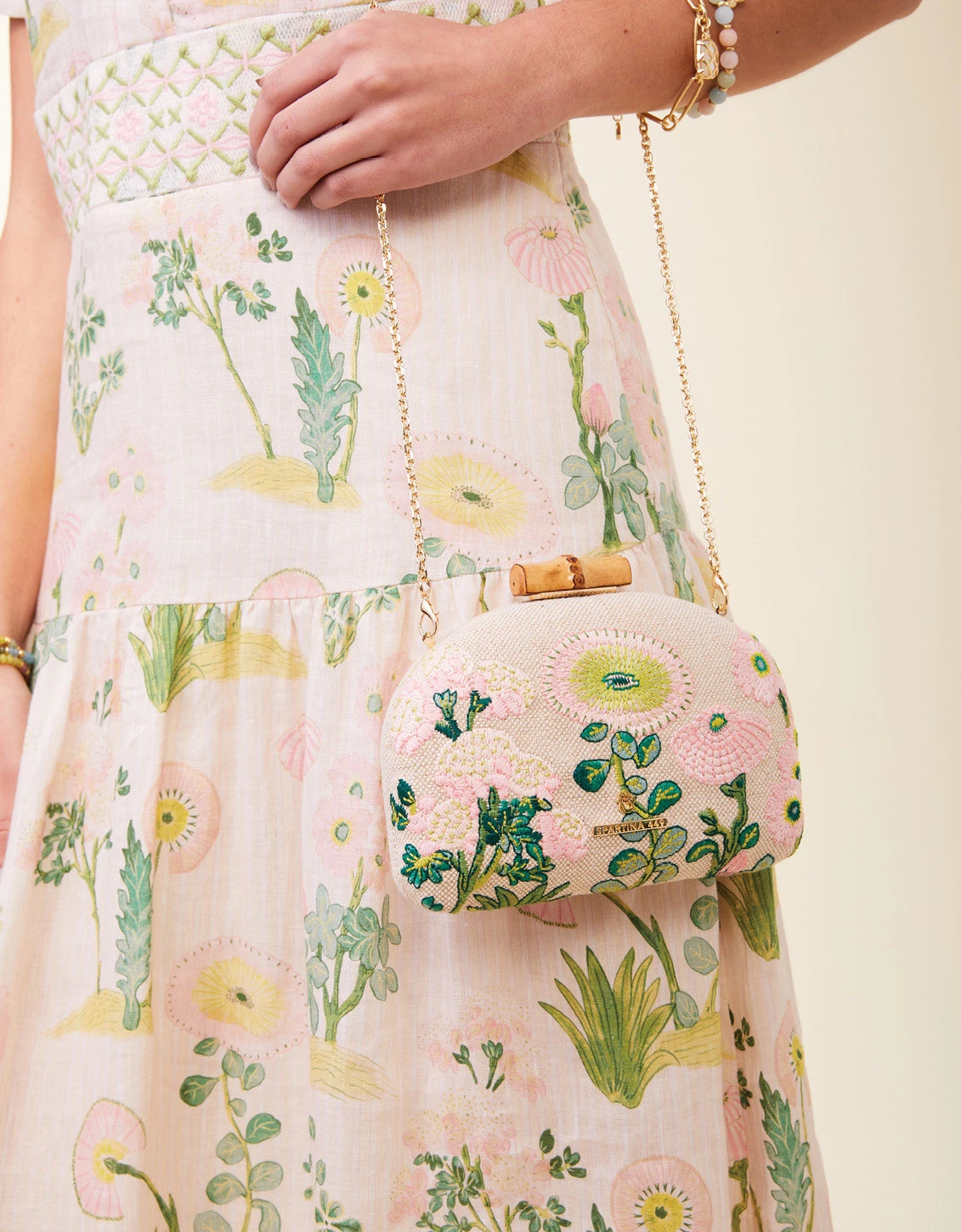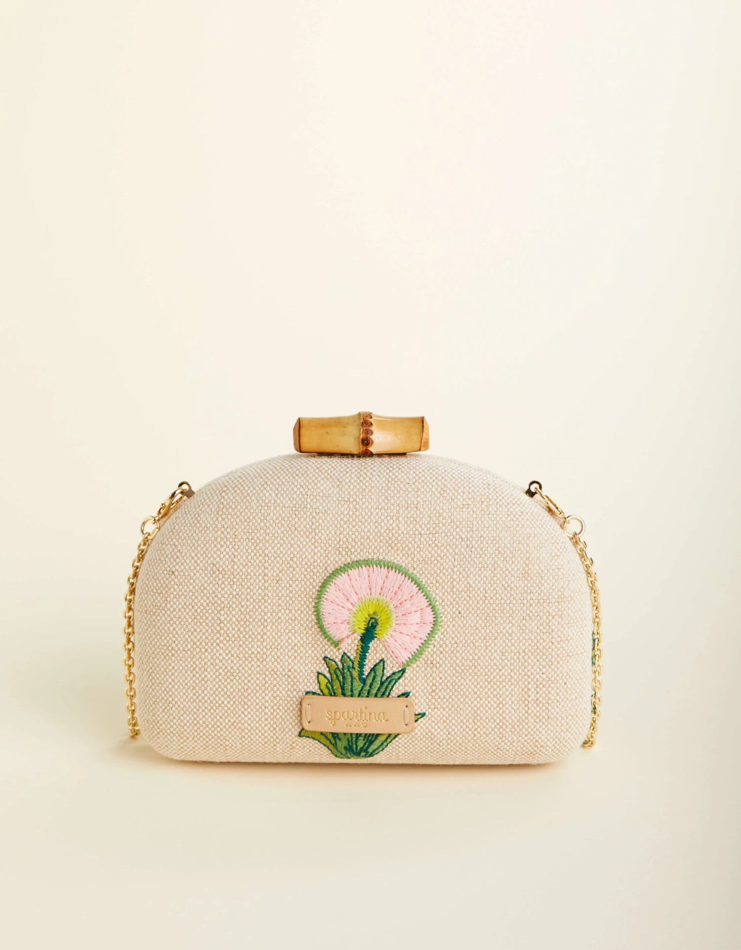 3 words to describe our Minaudiere? Petite, dainty, and feminine. Intricately embroidered on a cotton and jute blend, this handheld is topped with a bamboo clasp closure and an optional gold chain crossbody strap. Slip cards and lip gloss in the small interior.