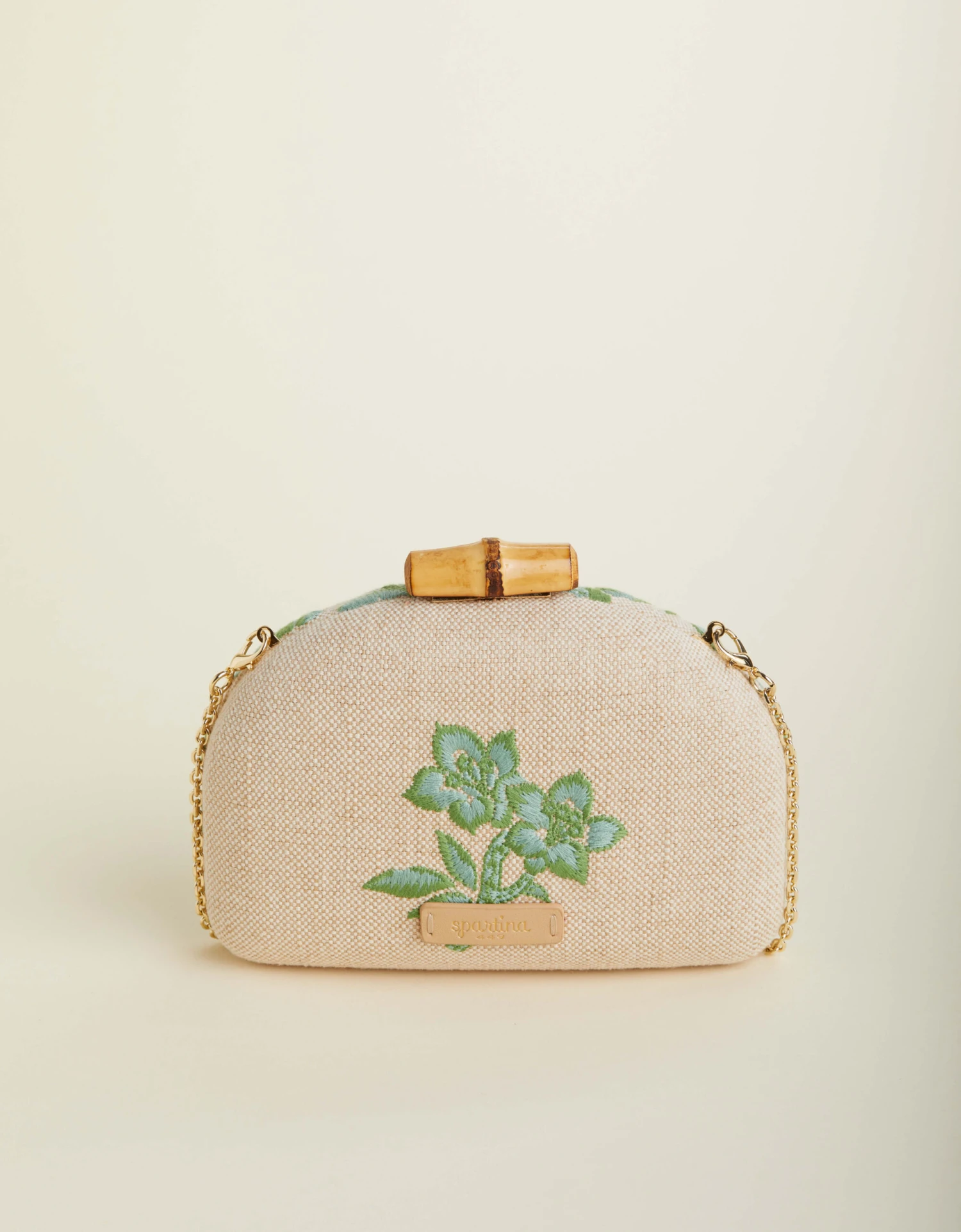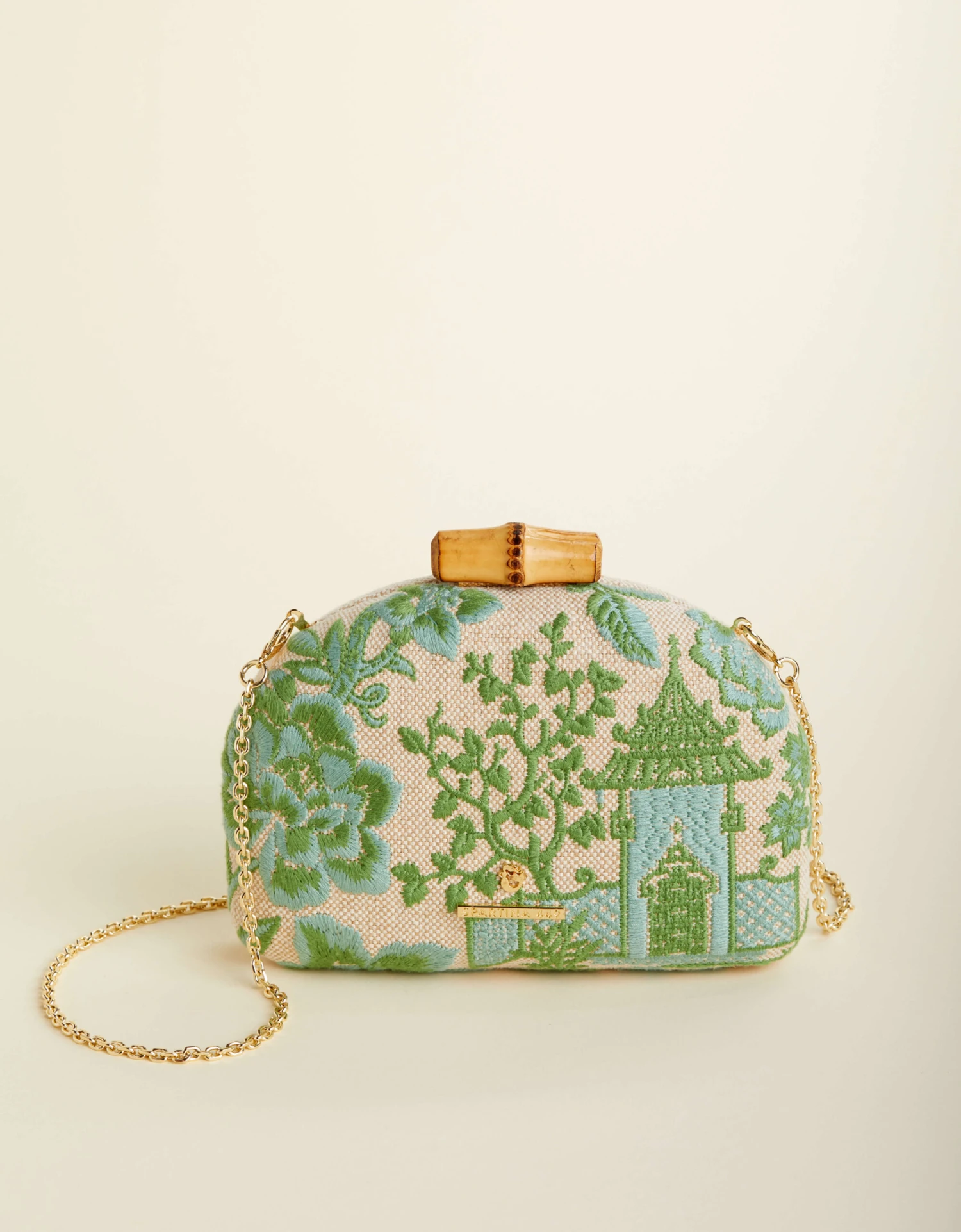 3 words to describe our Minaudiere? Petite, dainty, and feminine. Intricately embroidered on a cotton and jute blend, this handheld is topped with a bamboo clasp closure and an optional gold chain crossbody strap. Slip cards and lip gloss in the small interior.