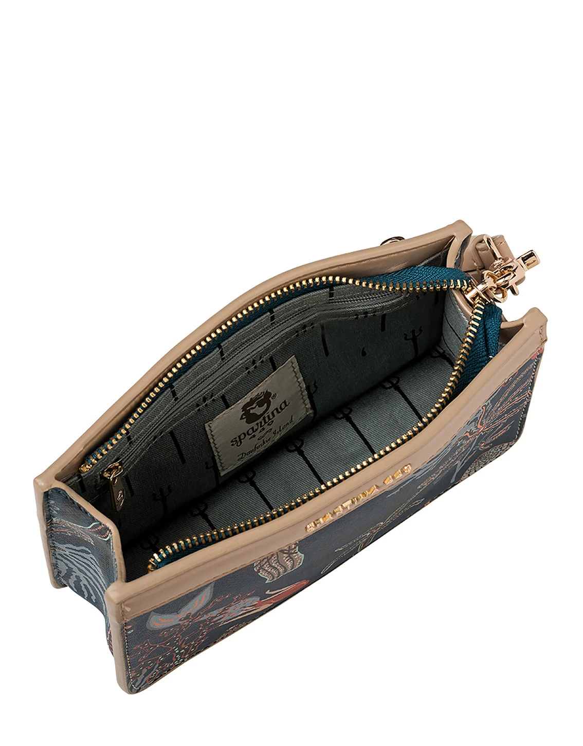 Totally on trend, this tri-shaped Mystic Mermaid Wristlet can stand on its own. A zip pocket on the back exterior complements the golden, mini mermaid stud and foil lettering on the detachable faux-leather wrist strap. Unzip and you’ll find all the essentials for your essentials: 3 card slots, a zip pocket, plus plenty of room for your phone, keys, whose-its and what’s-its.