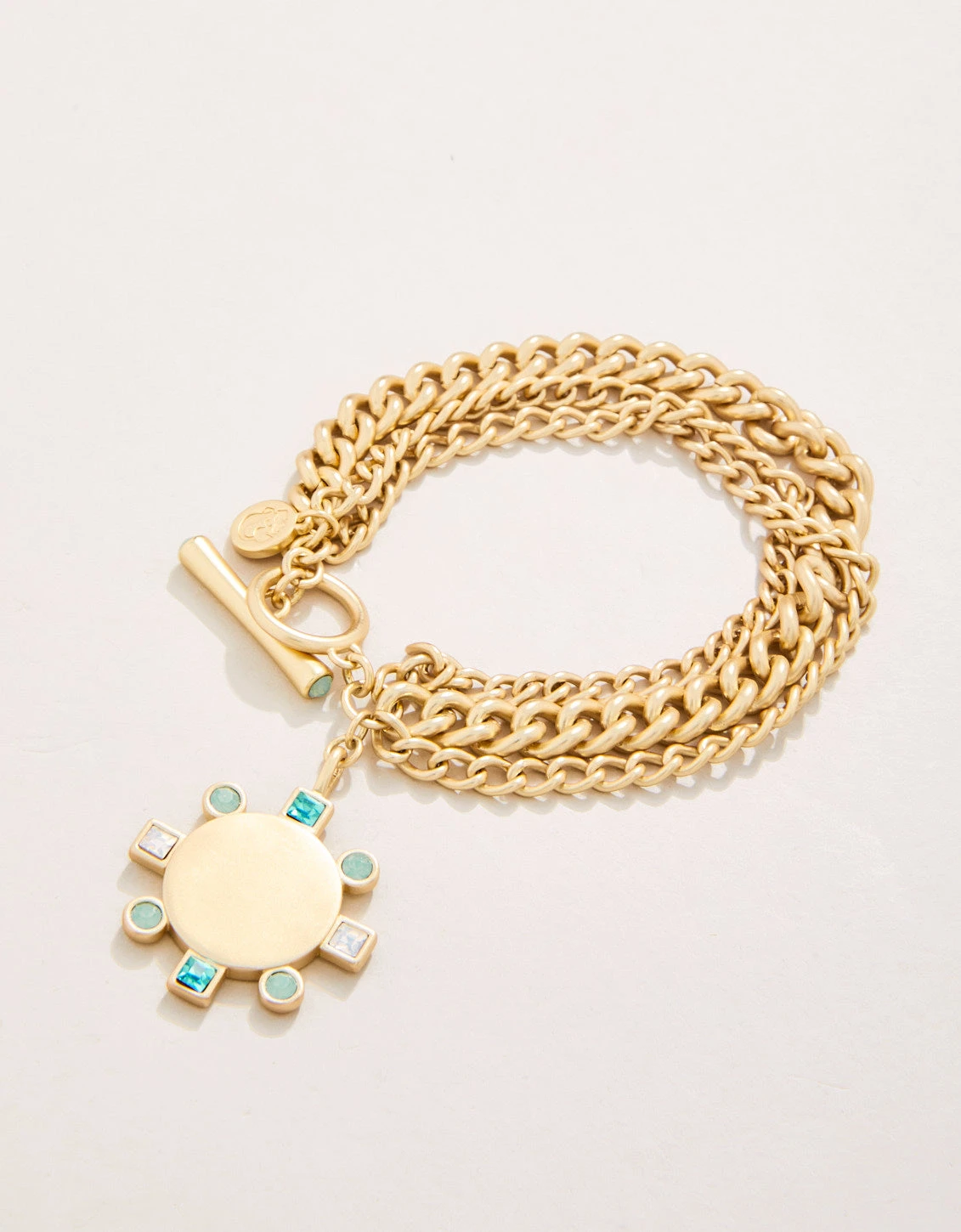 Sea foam and white opal glass crystals frame an 18kt matte gold plated center to create the stunning charm on our Mystic Moss Toggle Bracelet. The layered chunky chains and easy on toggle clasp add glam to your wrist.