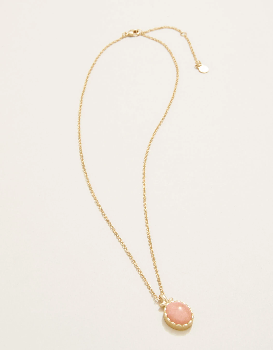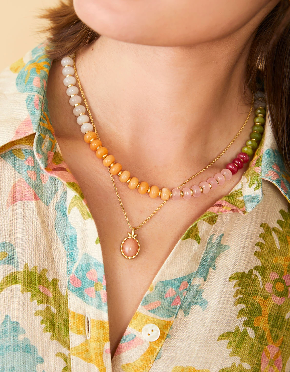 Our Nara Oval Necklace features a pink dyed jade stone intricately framed in 18kt gold plated scallops. The perfectly pretty complement to your sweet style.