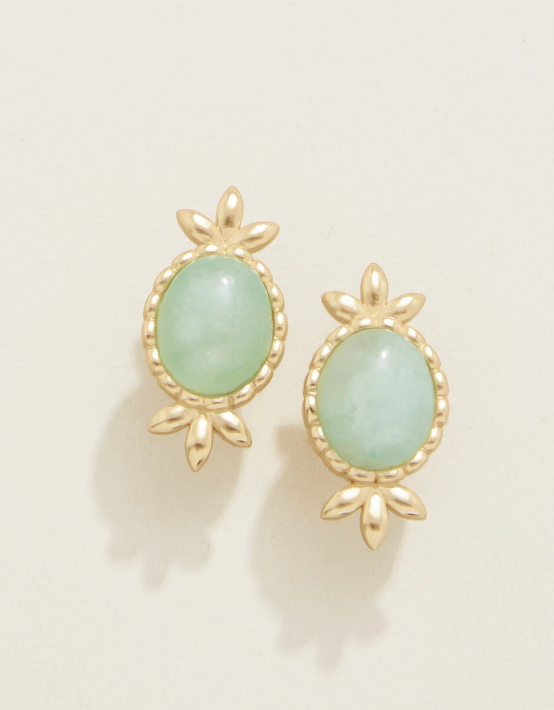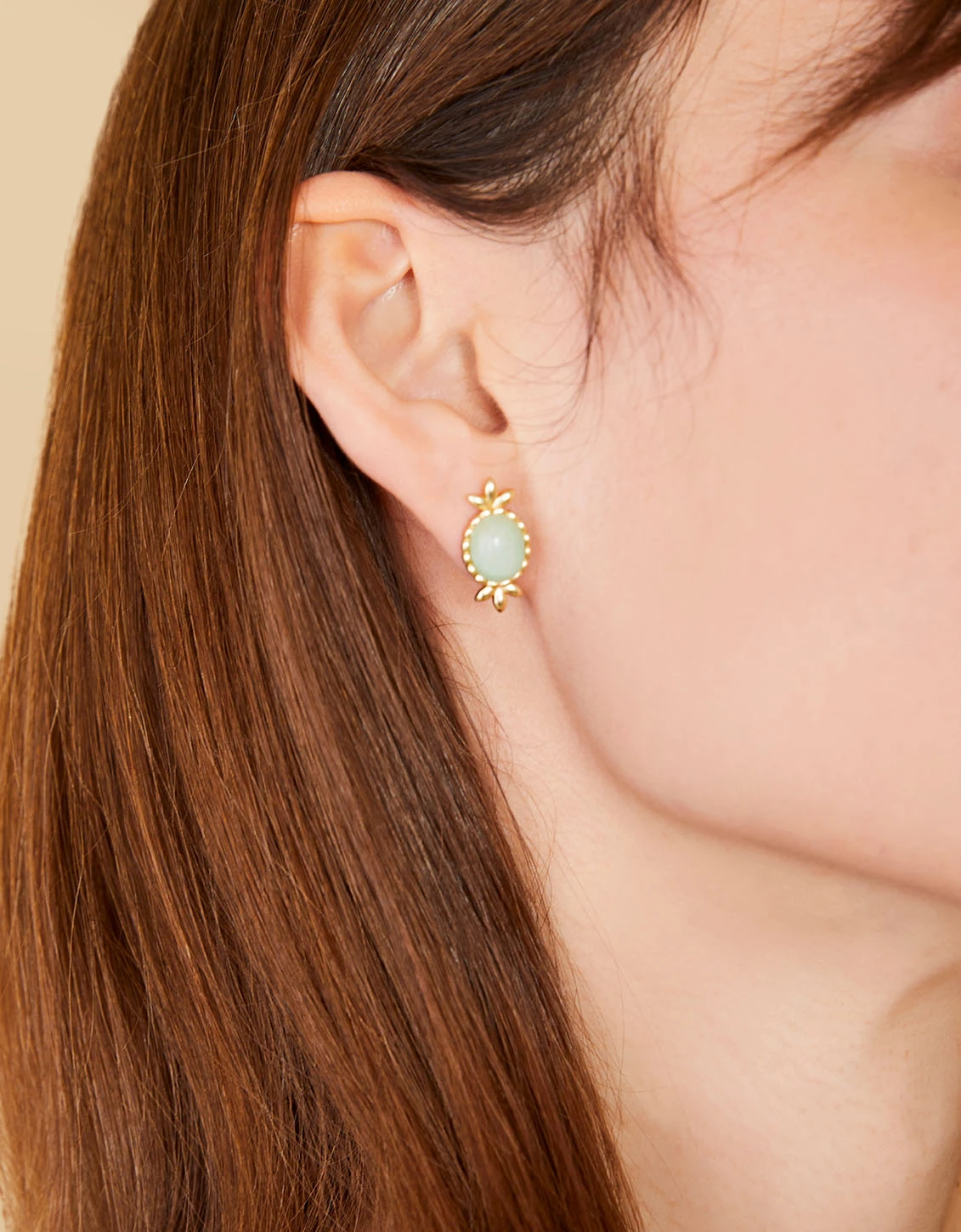 Our Nara Oval Stud Earrings feature a jade stone intricately framed in 18kt gold plated scallops. The perfectly pretty complement to your sweet style.