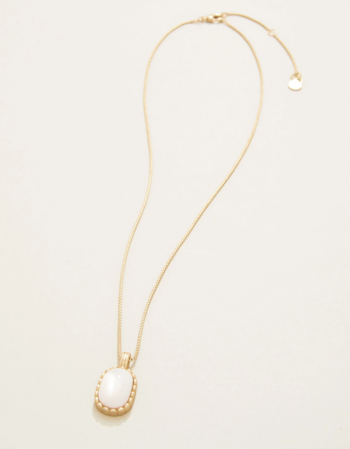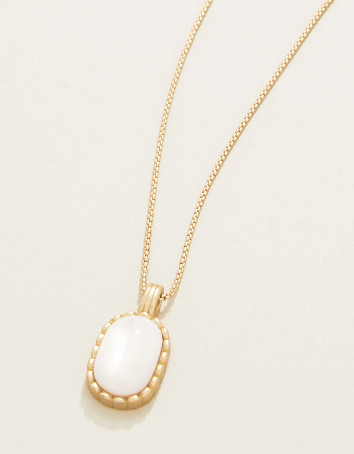 Our Nara Petite Necklace features shimmering mother-of-pearl intricately framed in 18kt gold plated scallops. Petite and pretty.