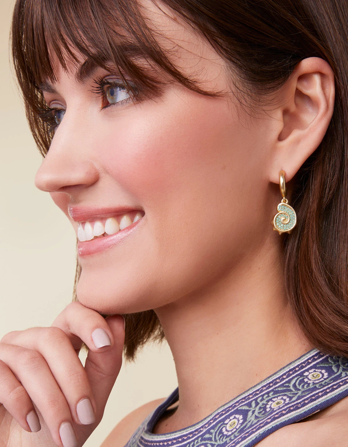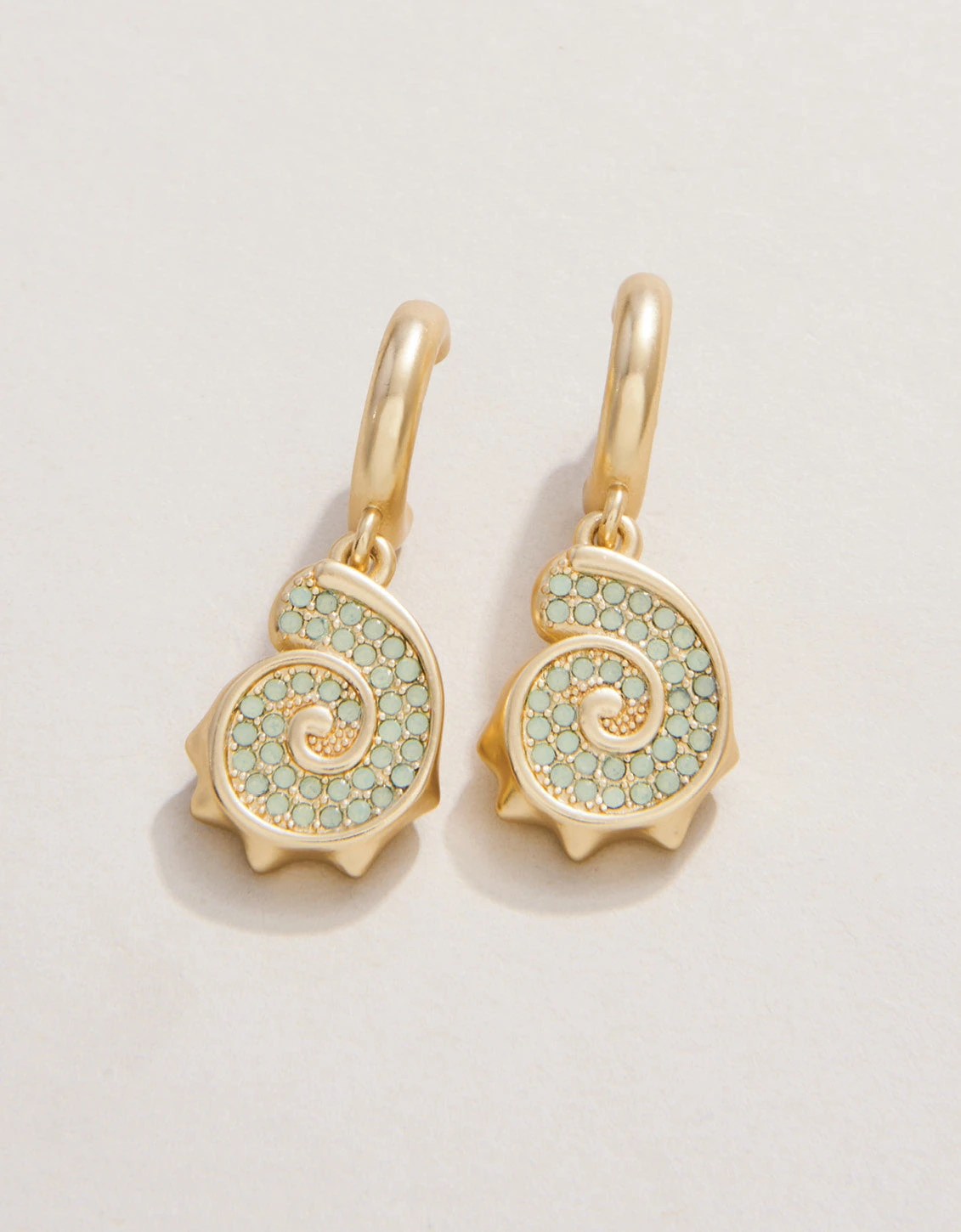 The ocean calls to you in our Nautilus Drop Earrings. These drop earrings feature a 18kt matte gold plated hoops with sea foam gem encrusted seashell charms.