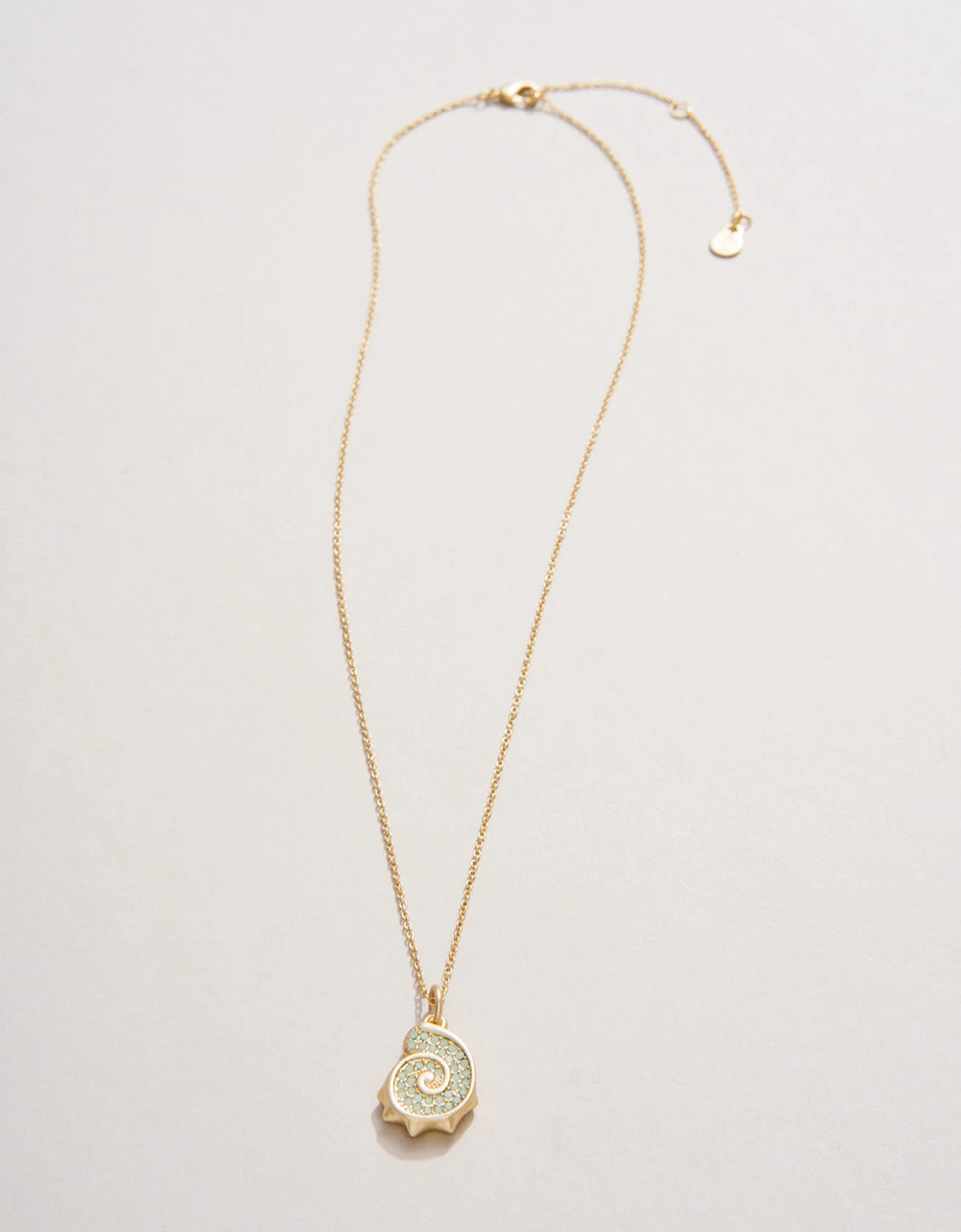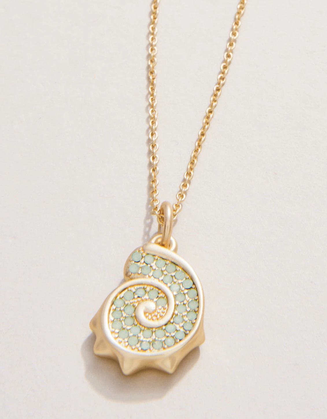 The ocean calls to you in our Nautilus Necklace. This pendant necklaces features a delicate, dainty, 18kt matte gold plated chain with a sea foam gem encrusted seashell charm pendant.