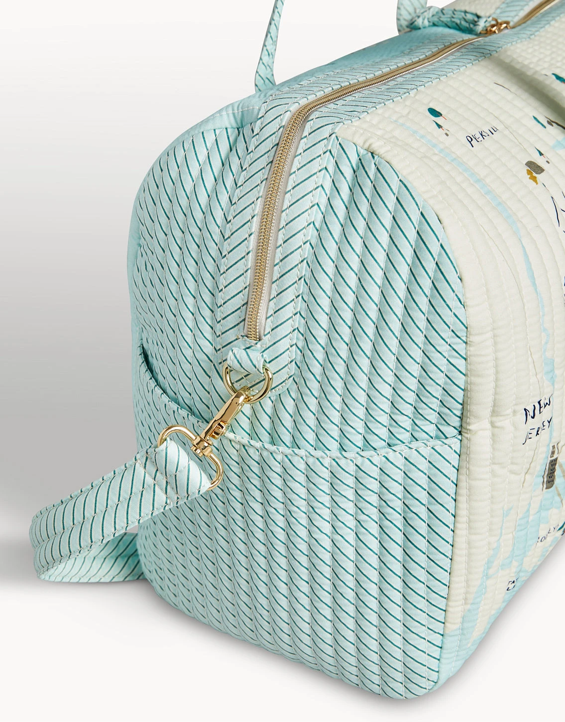 Large, lightweight, washable, cotton Duffle bag with wide opening zipper top, 3 inside slip pockets, 1 large inside zipper pocket, 2 side slip pockets and a removable/adjustable crossbody strap. Complete your Spartina travel set with our washable, 100% quilted cotton bags and accessories, made in your favorite map destinations. These lightweight travel pieces are made to make weekend trips as breezy as the coasts they’re inspired by.
