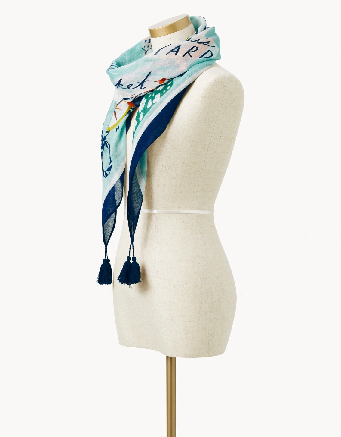 Show off your favorite local with our Greetings From Square Scarves. The super soft and light as air texture in our linen viscose blend fabric with colorful corner tassels gives you comfort and style on breezy days.