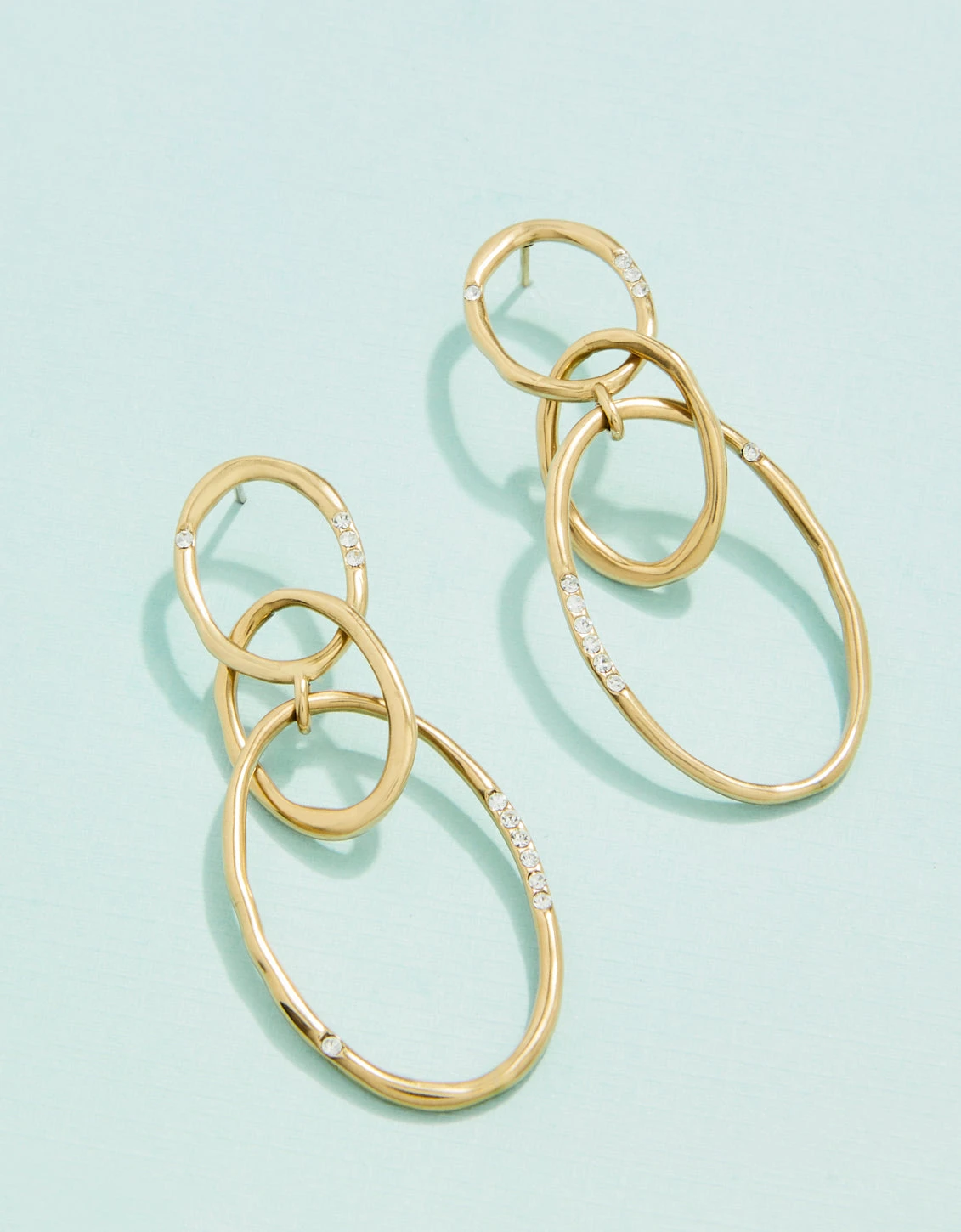 Our statement Okatie Earrings complement your elevated style with stunning crystals and swinging movement. Designed to shine through everyday wear, exercise, showers and a summer at the beach in tarnish-free 14kt gold vacuum plating.