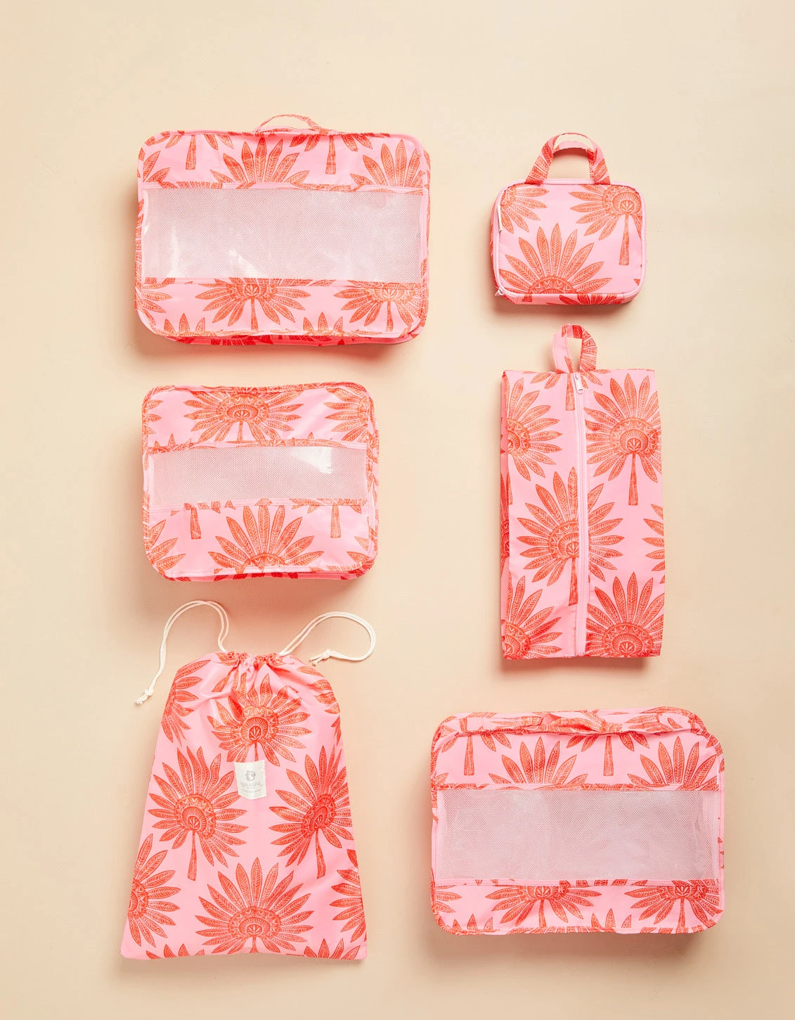 Packing has never been easier with our 6 piece Packing Cube set. This set has every size you need to keep your belongings organized and compact. It includes 2 large packing cubes, medium packing cube, drawstring laundry bag, zip shoe bag, and cosmetic bag. Travel in style with this must have set!