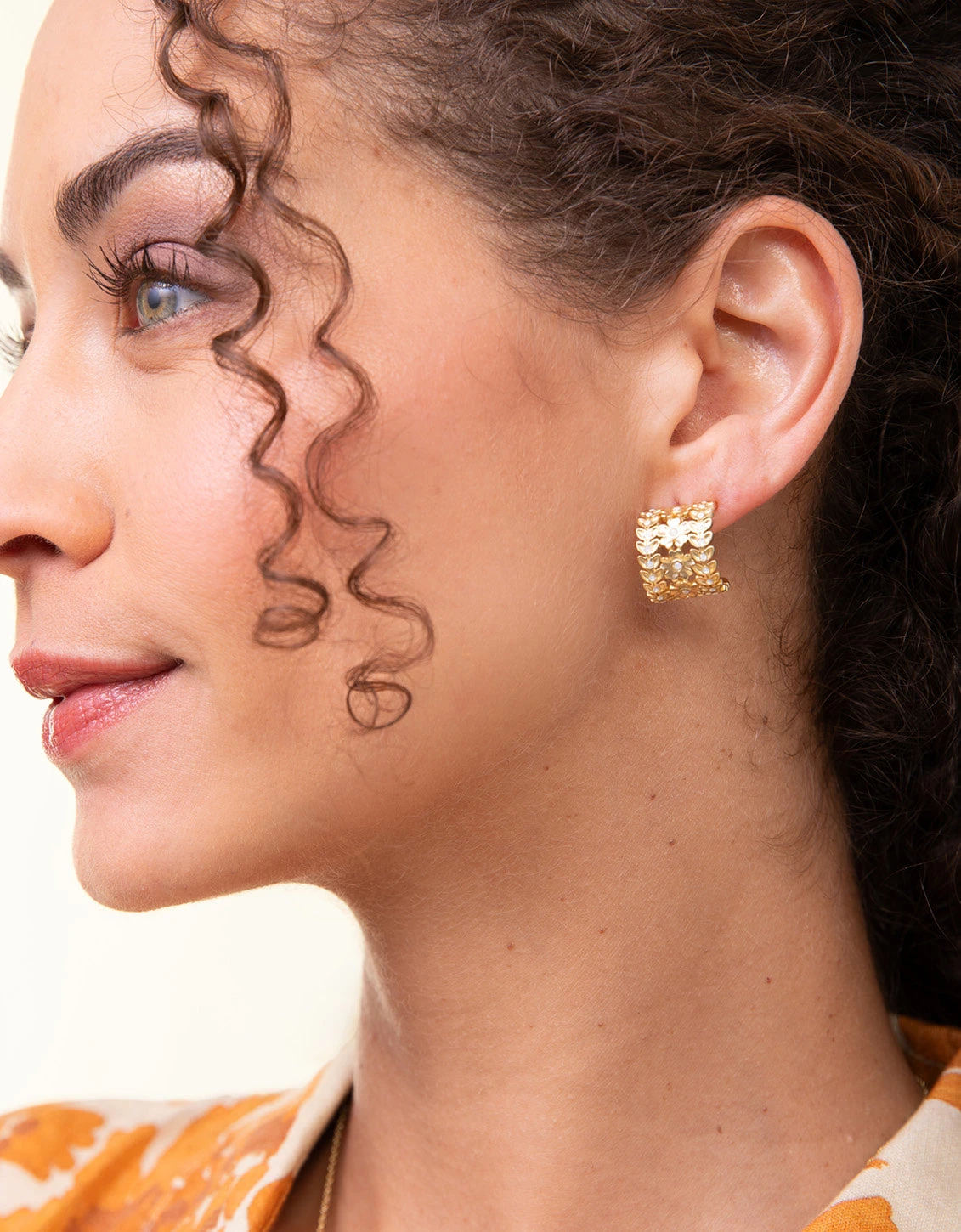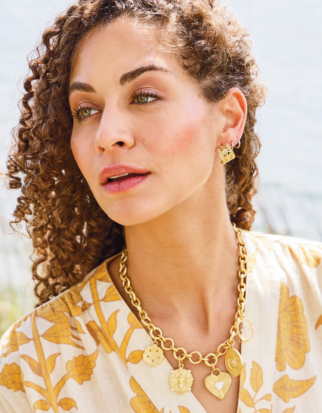 Your look isn’t complete without these statement hoops! Natural style with a little extra glam, our Parkwood Midi Hoop Earrings stun in 18kt matte gold plated petals with sparkling white opal glass crystals.