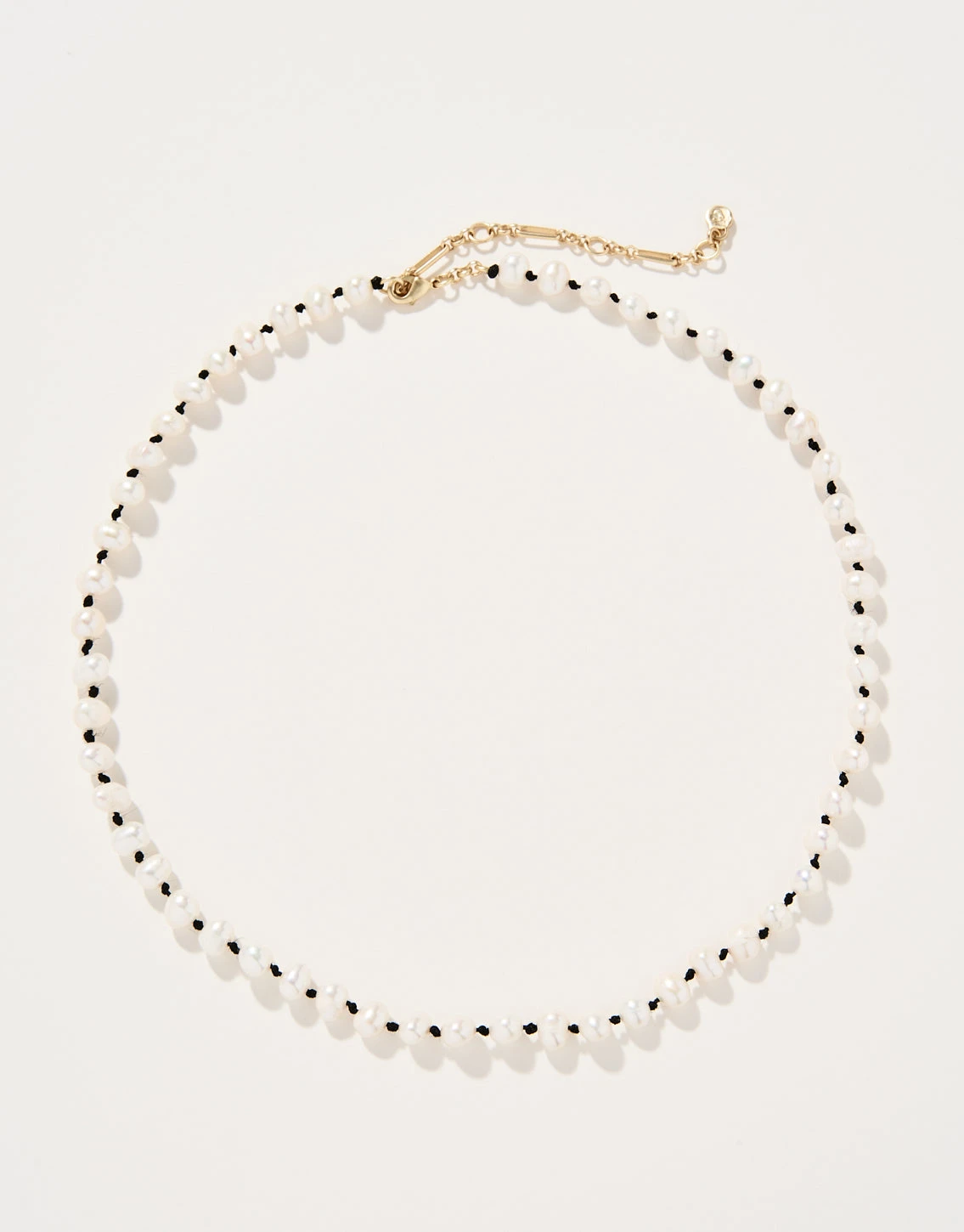 Capture that timeless vintage look through our Pearl Rope Necklace in 18KT matte gold plating with its freshwater pearls tied along a black nylon rope.