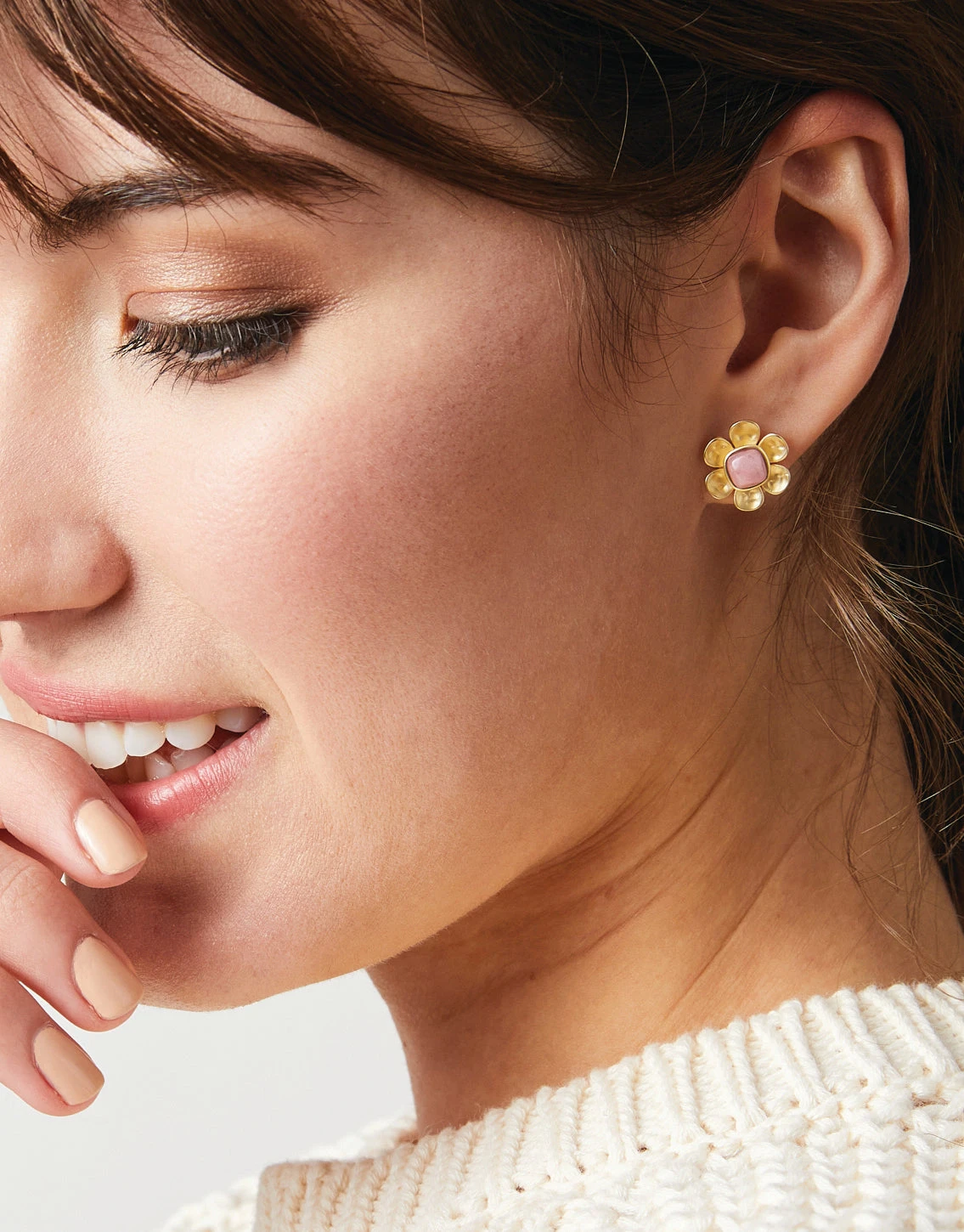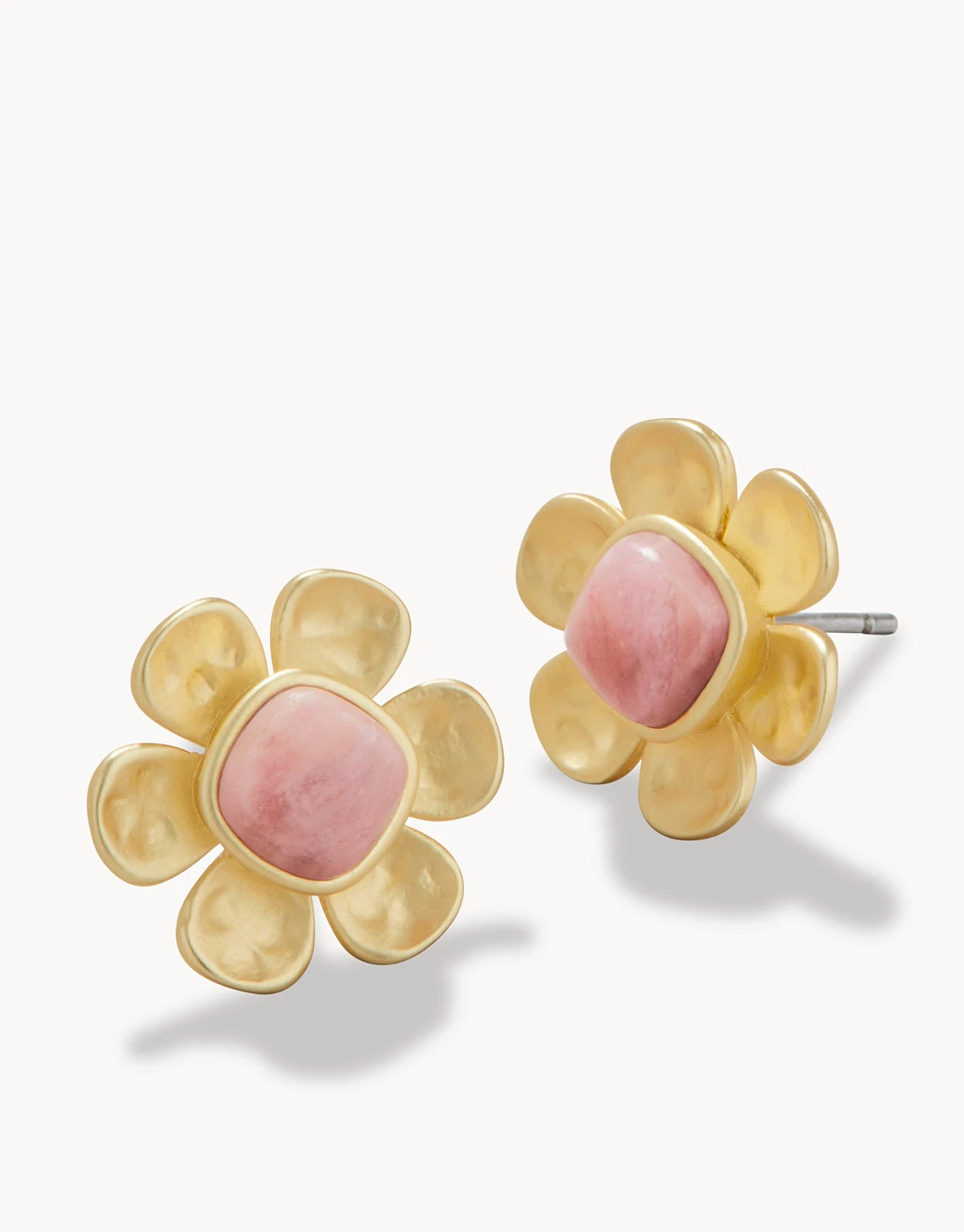 Golden primrose petals topped with natural stones wrap around these vintage inspired Primrose Stud Earrings. These earrings shine in Matte 18kt Gold Plating featuring Pink Rhodonite natural stones. Please note: This design features natural stones and each piece is one-of-a-kind. Colors and patterns may vary slightly from the image shown.