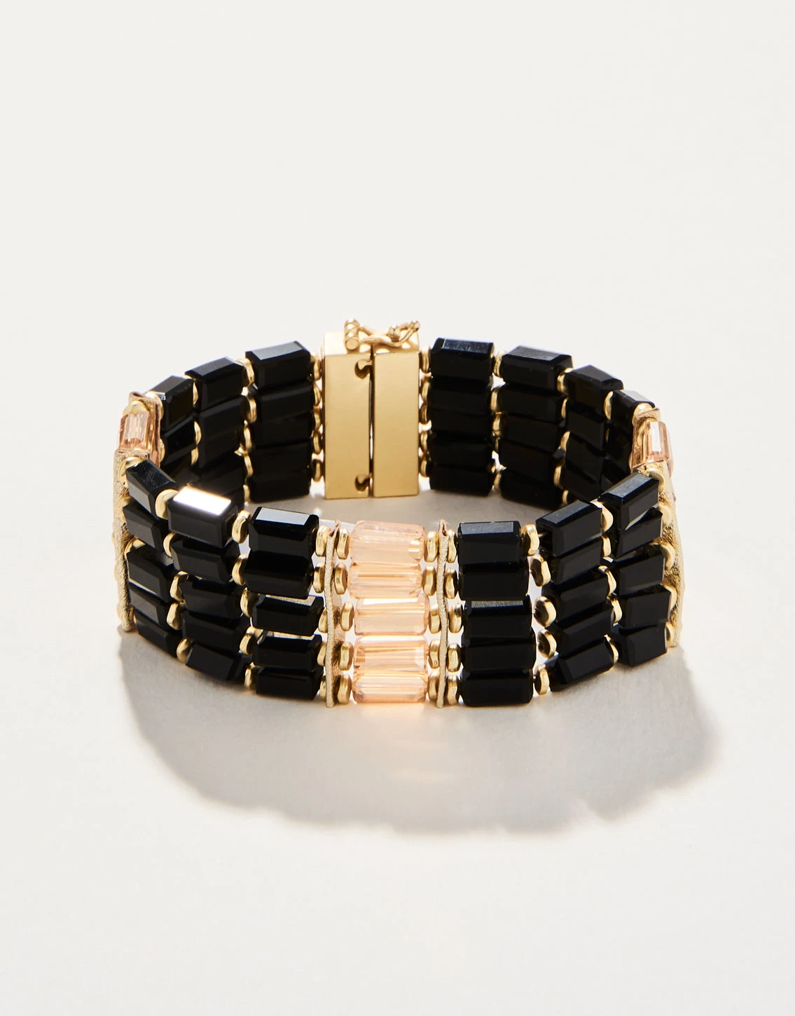 Our René Bracelet captures that timeless vintage look in a beautiful deep hue of black faceted glass and metal beads. Set in 18kt matte gold plating, you’ll reach for this piece over and over again.