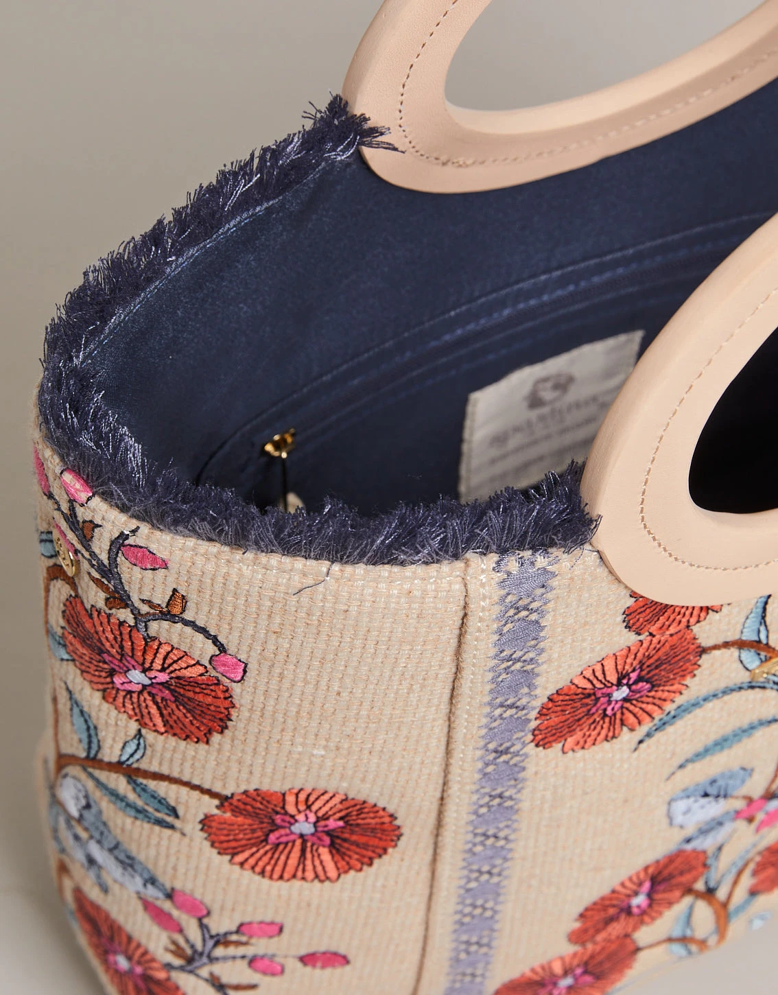 Always ahead of the curve, this Resort Tote and its double hoop handles put a chic spin on the classic bag. Standing upon four golden mermaid feet, our rich, durable natural jute fabric is accented with genuine leather and embroidered with intricate floral sprigs. Opt to wear the crossbody strap, and you’ll love how the open top keeps phone and keys within reach yet organized by a zip and two slip pockets.
