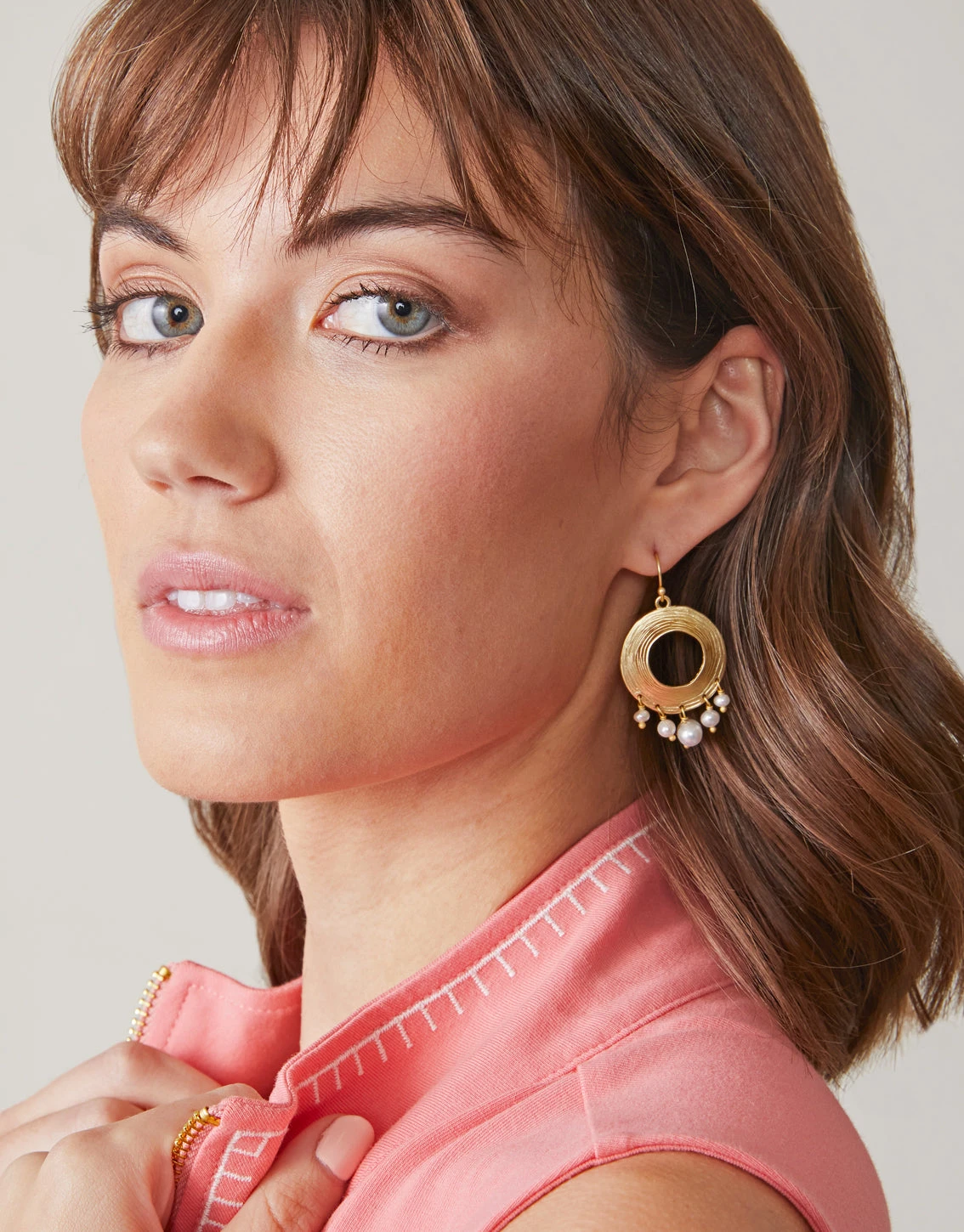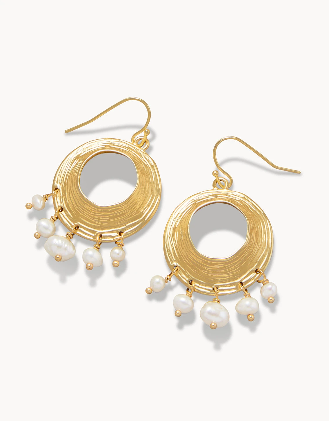 Freshwater pearls drip from an 18 KT matte gold plated halo with textures of the ocean’s ripples in our Ripple Earrings.
