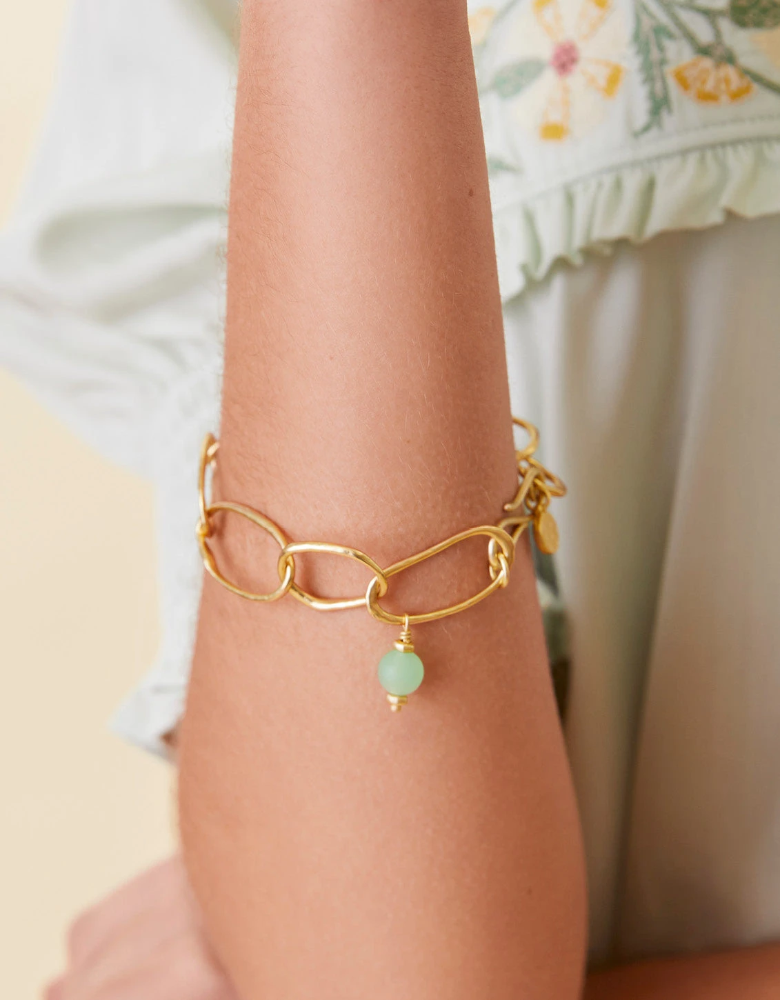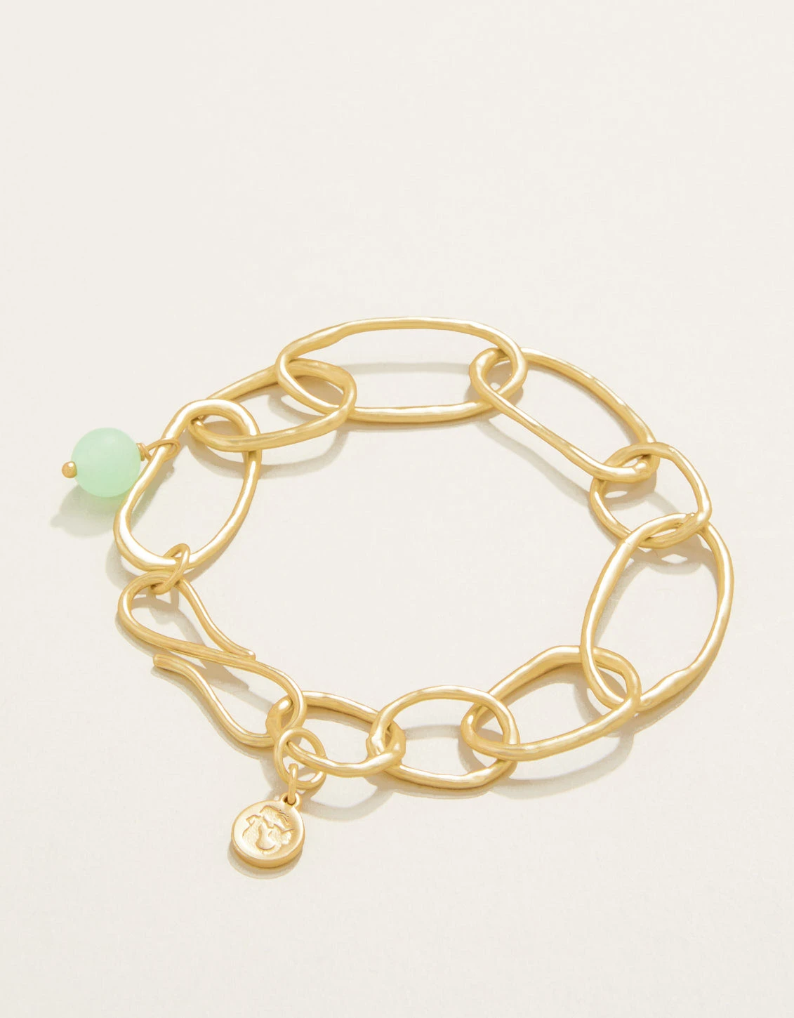 Inspired by the beauty of a flowing river, this custom chain with textured organic links plated in lustrous matte 18kt gold is the perfect layer for any wrist. Finished with a textured s-hook clasp and topped with a sea foam glass bead.