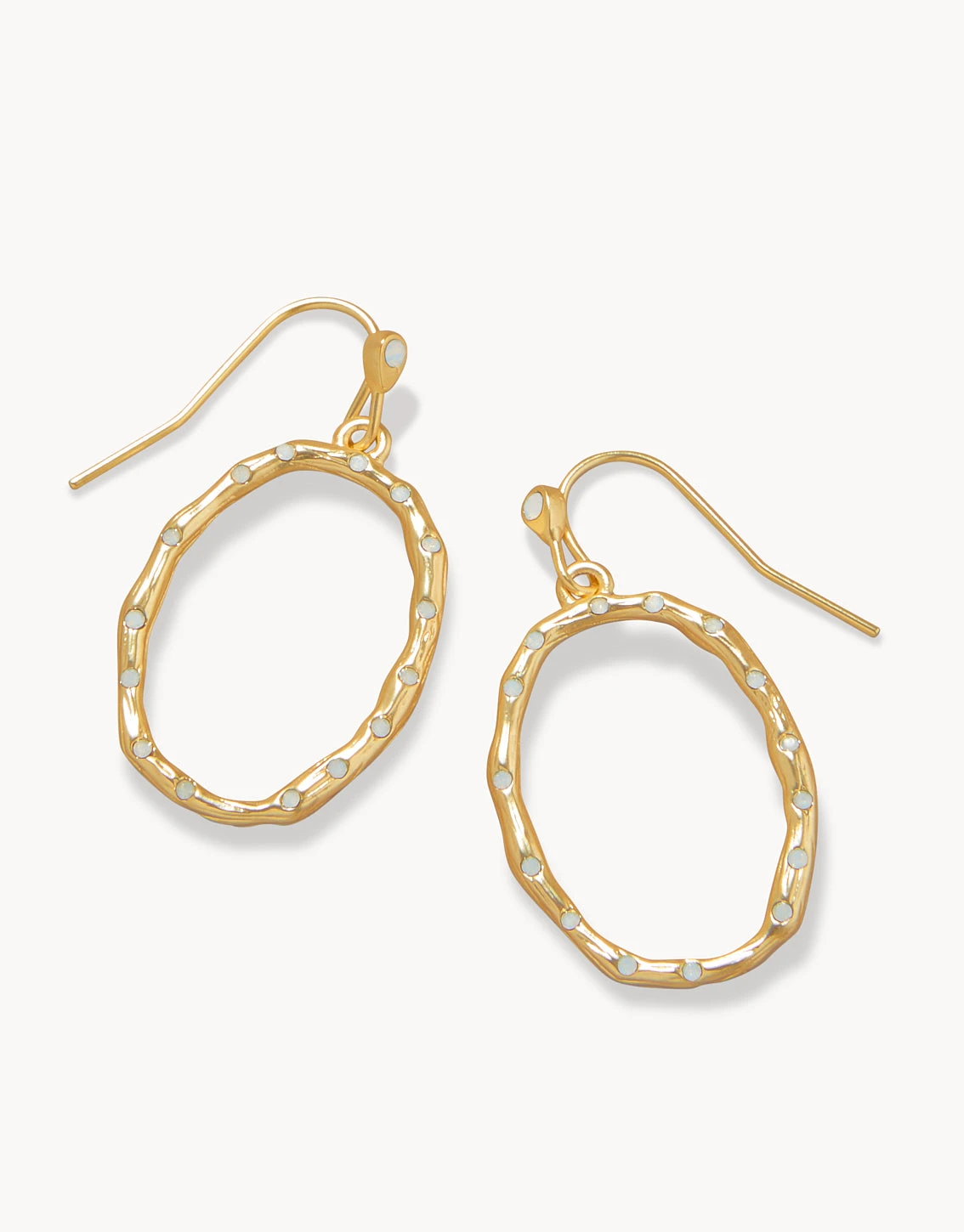 Inspired by the sparkling texture of a sandy beach awash with sea foam, our Sand Bar Ripple Earrings shimmer with white opal crystals set in softly textured lightweight Matte 18kt Gold Plated settings. Pair with our other Sand Bar designs for easy styling.