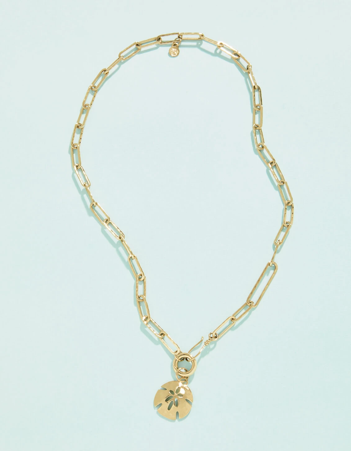 Designed to shine through everyday wear, exercise, showers and a summer at the beach in tarnish free 14kt gold vacuum plating. This textured paperclip chain charm necklace can we worn multiple ways with it’s unique hook closure. The built in charm clasps also allows you to take charms on and off. Comes with a summer ready sand dollar charm.