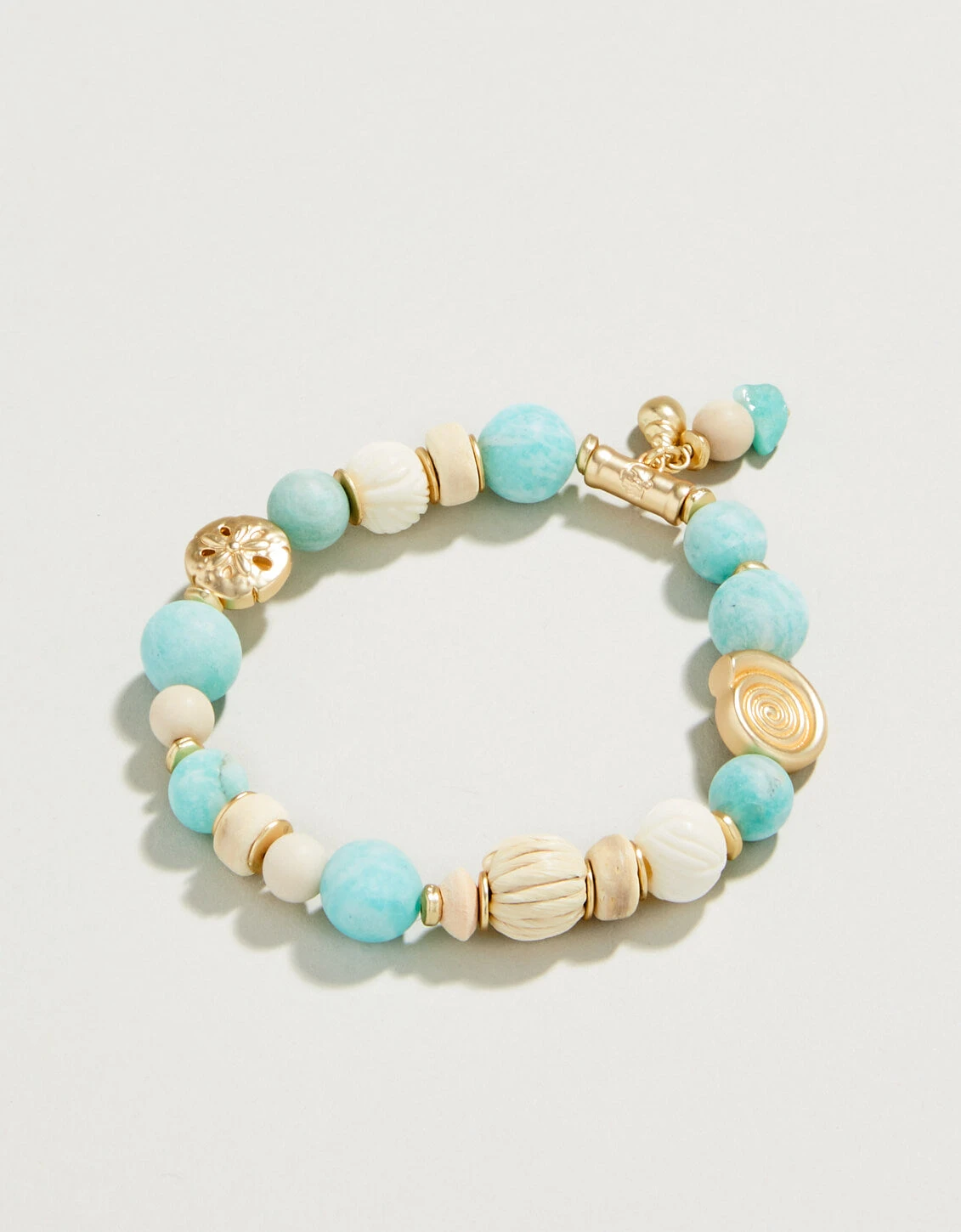 Inspired by a tropical vacation, our Sea Breeze Stretch Bracelet features carved bone, amazonite, natural stone, wood, and 18kt matte gold plated metal beads. Please note: This design features natural stones and each piece is one-of-a-kind. Colors and patterns may vary slightly from the image shown.