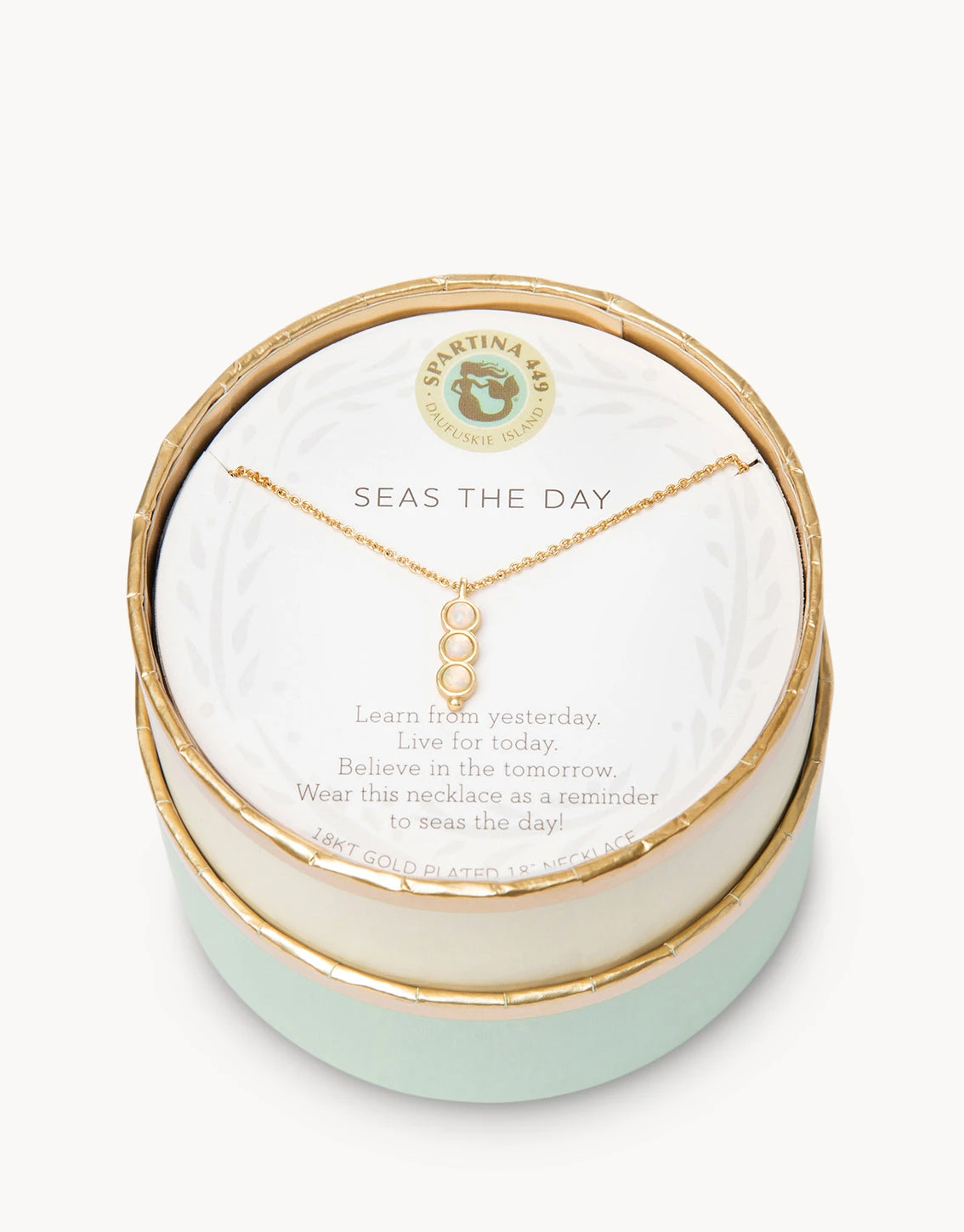 Wear our Seas the Day Necklace as a reminder to live for today. Featuring a triple opalescent charm, this special piece comes packaged inside a beautiful box with the message: “Learn from yesterday. Live for today. Believe in the tomorrow. Wear this necklace as a reminder to seas the day!”
