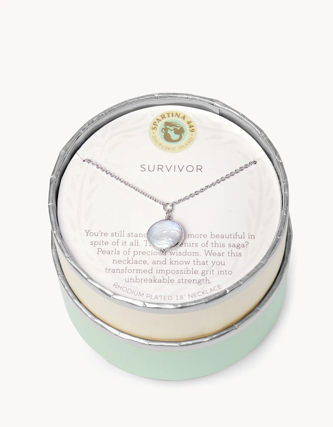 Wear our Survivor Necklace as a reminder that you are strong. Featuring an coin pearl pendant, this special piece comes packaged inside a beautiful box with the message: “You’re still standing– even more beautiful in spite of it all. The souvenirs of this saga? Pearls of precious wisdom. Wear this necklace, and know that you transformed impossible grit into unbreakable strength.”