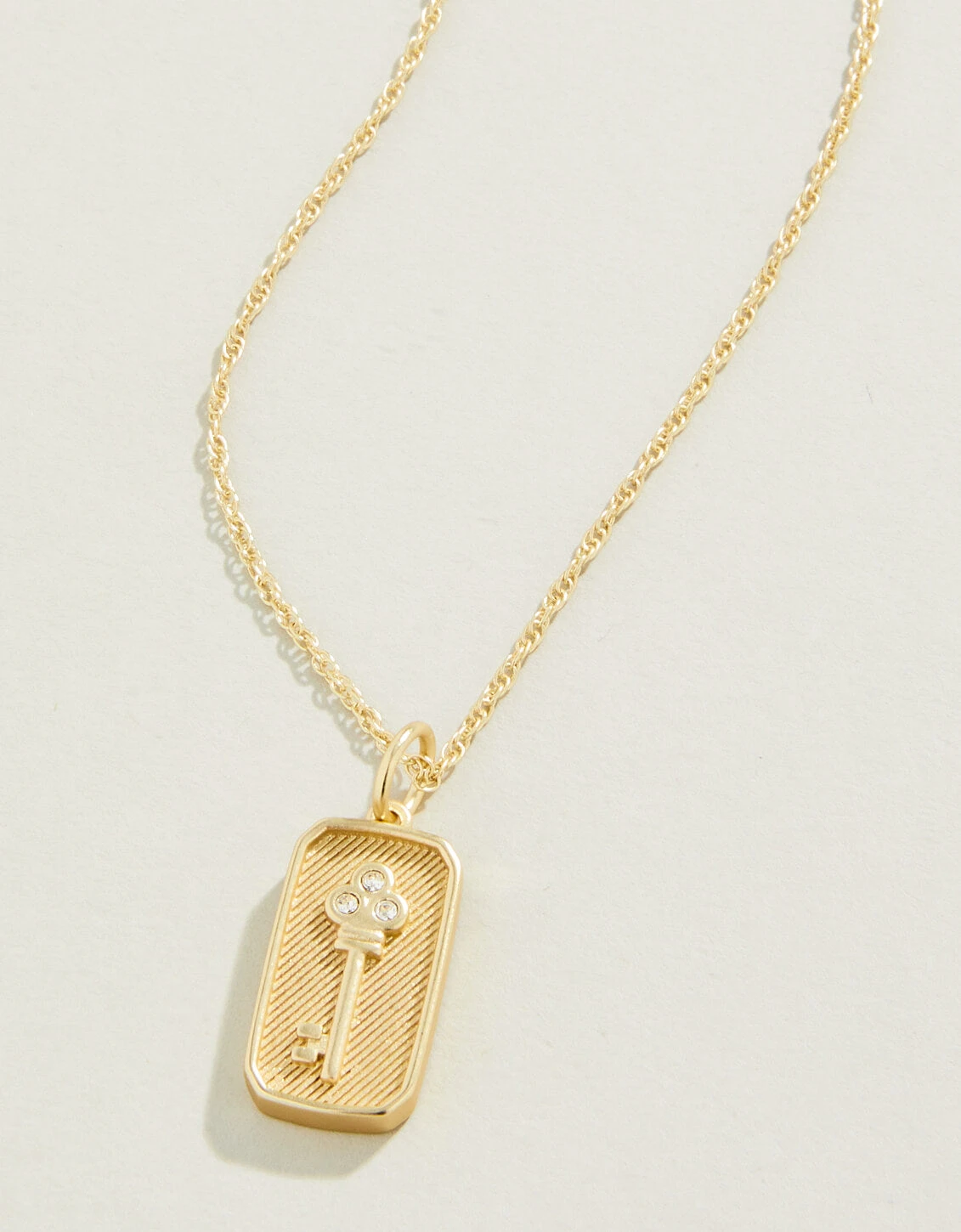 This necklace is a lock for an everyday classic look. This double-sided Secret Key Necklace features lustrous 18kt matte gold plating and glass crystals.