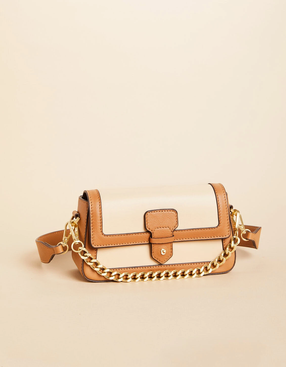 All the style in soft, premium, natural grain leather with a matte gold chain link shoulder strap. This trendy shoulder bag converts to a crossbody and will be the bag you reach for over and over again.