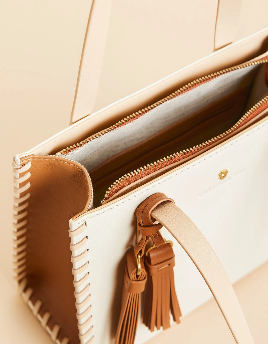 This beautifully crafted Siren Tatum Tote, with the whipstitching along the sides of the bag, made of soft, premium, natural grain leather, is a staple piece. The zip-top closure keeps all of your belongings secure, and with the slip-back pocket, you can easily access your phone. The color blocked style is a must-have staple in your wardrobe.