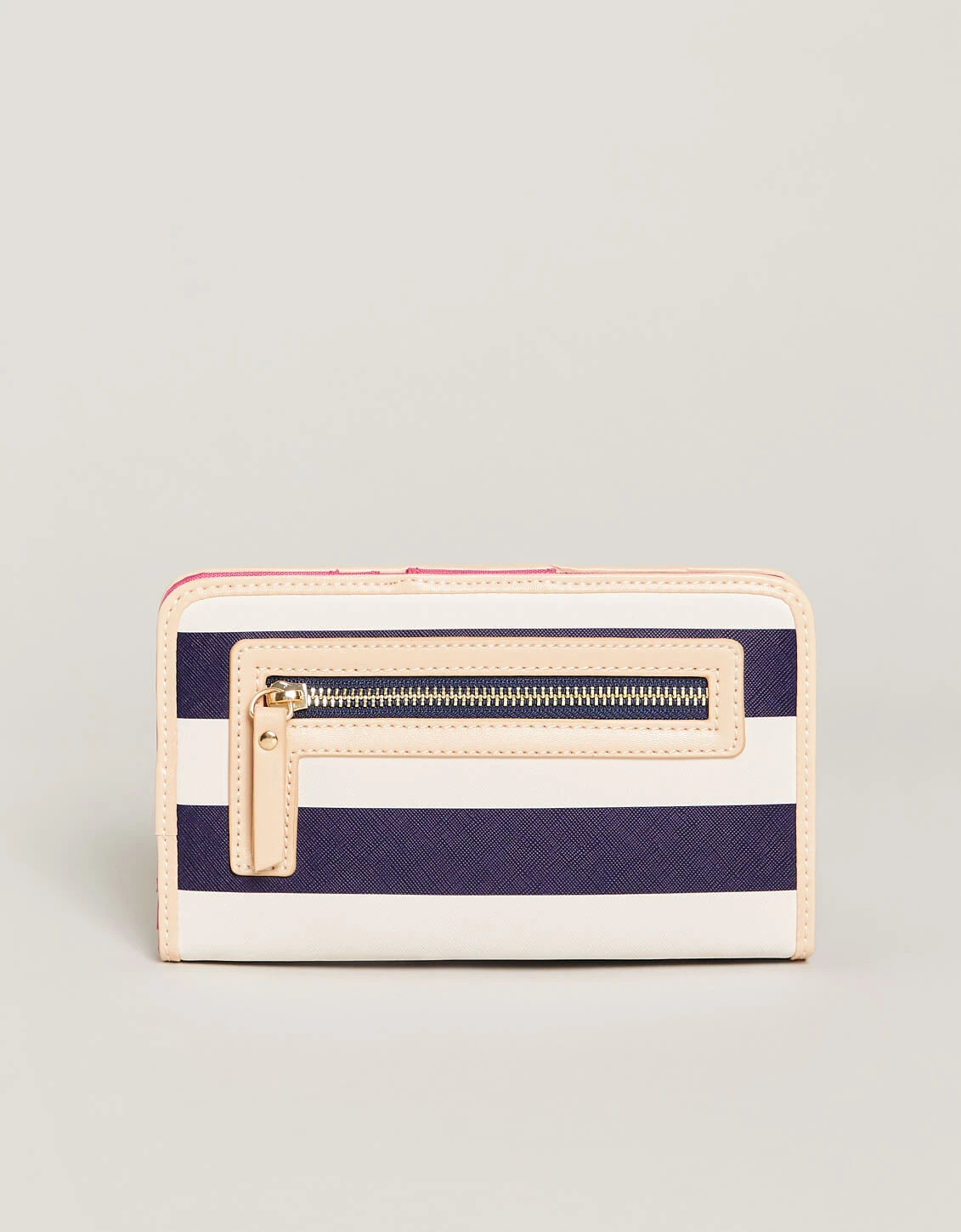Sail away with our new lightweight vinyl Navy Stripe Snap Wallet! With rich navy & cream stripes, this collection will be your new go-to all year long. It features a snap closure that opens up to 15 card slots, an ID window, and 3 bill slots. A hot pink interior makes a pop every time you reach for your card!