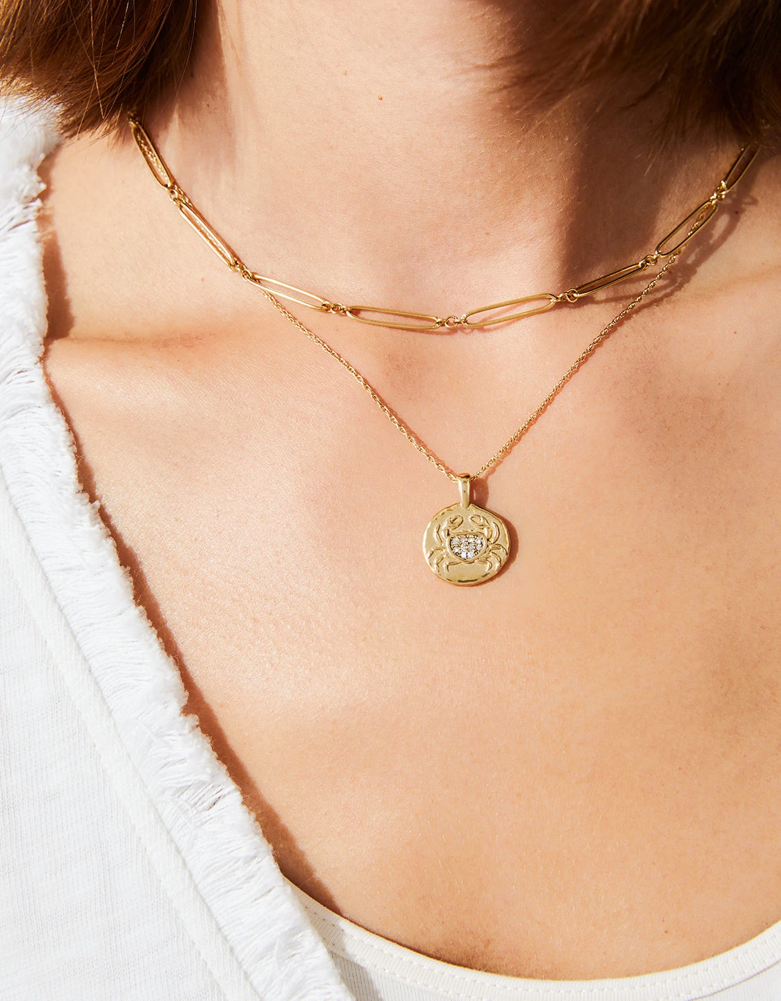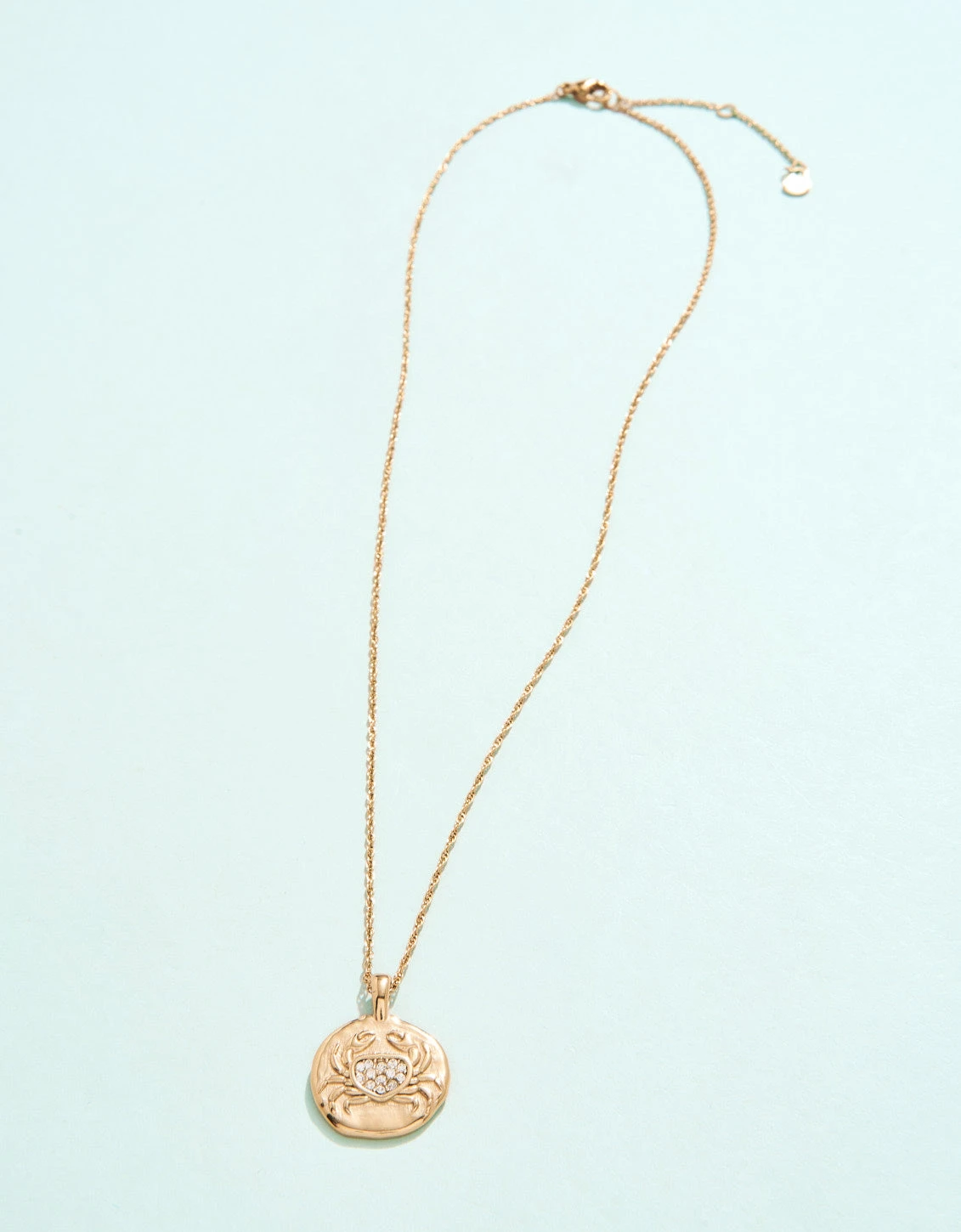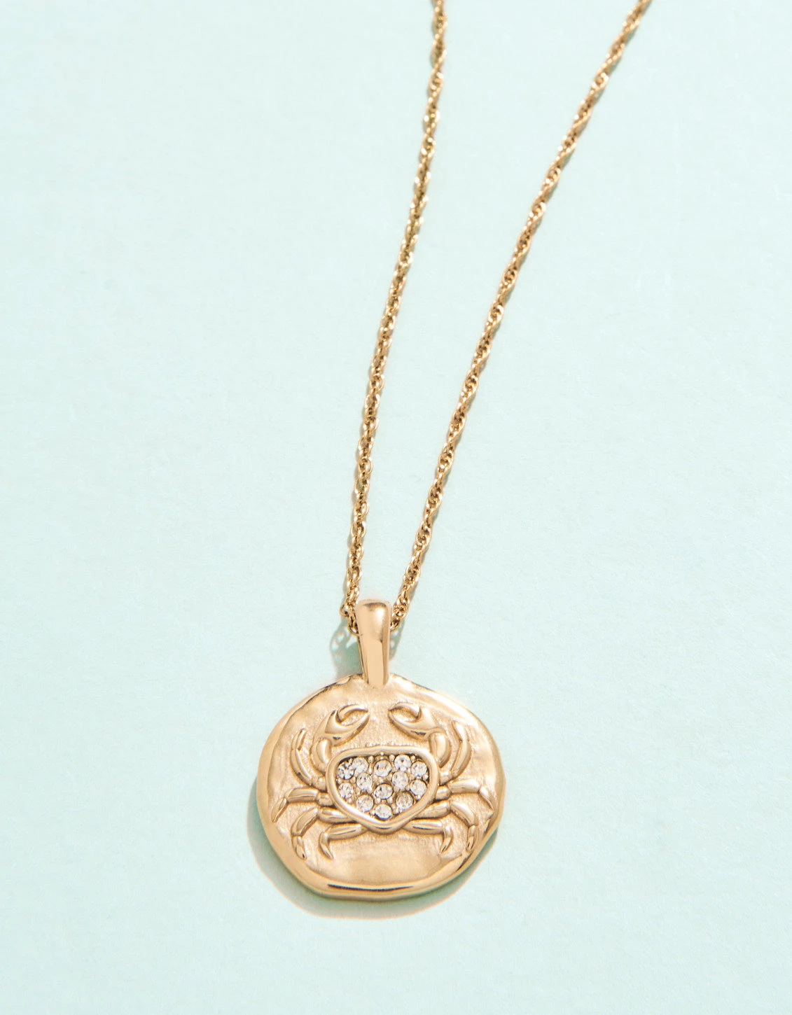 Made of tarnish free, water resistant 14kt shiny gold plating over stainless steel, this Snow Crab Medallion Necklace features a warm, golden coin pendant with an embossed snow crab icon studded with glass crystals. This is a necklace you will never have to take off, designed to shine through everyday wear, exercise, showers and a summer at the beach.
