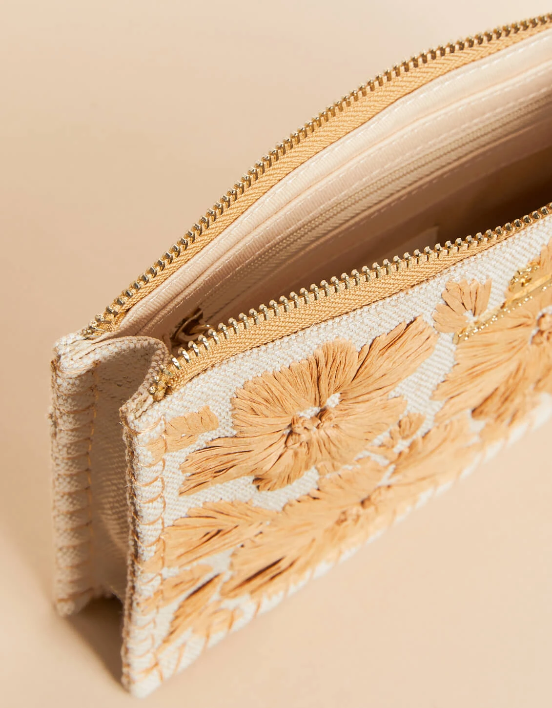 Made in a luxurious cotton and jute blend, our on-the-go Sophie Straw Wristlet is embroidered in a neutral raffia floral design to create a unique look only this intricate technique can provide. Open the top zipper and you’ll find 3 RFID protected card slots and a zipper pocket for your change or gloss.
