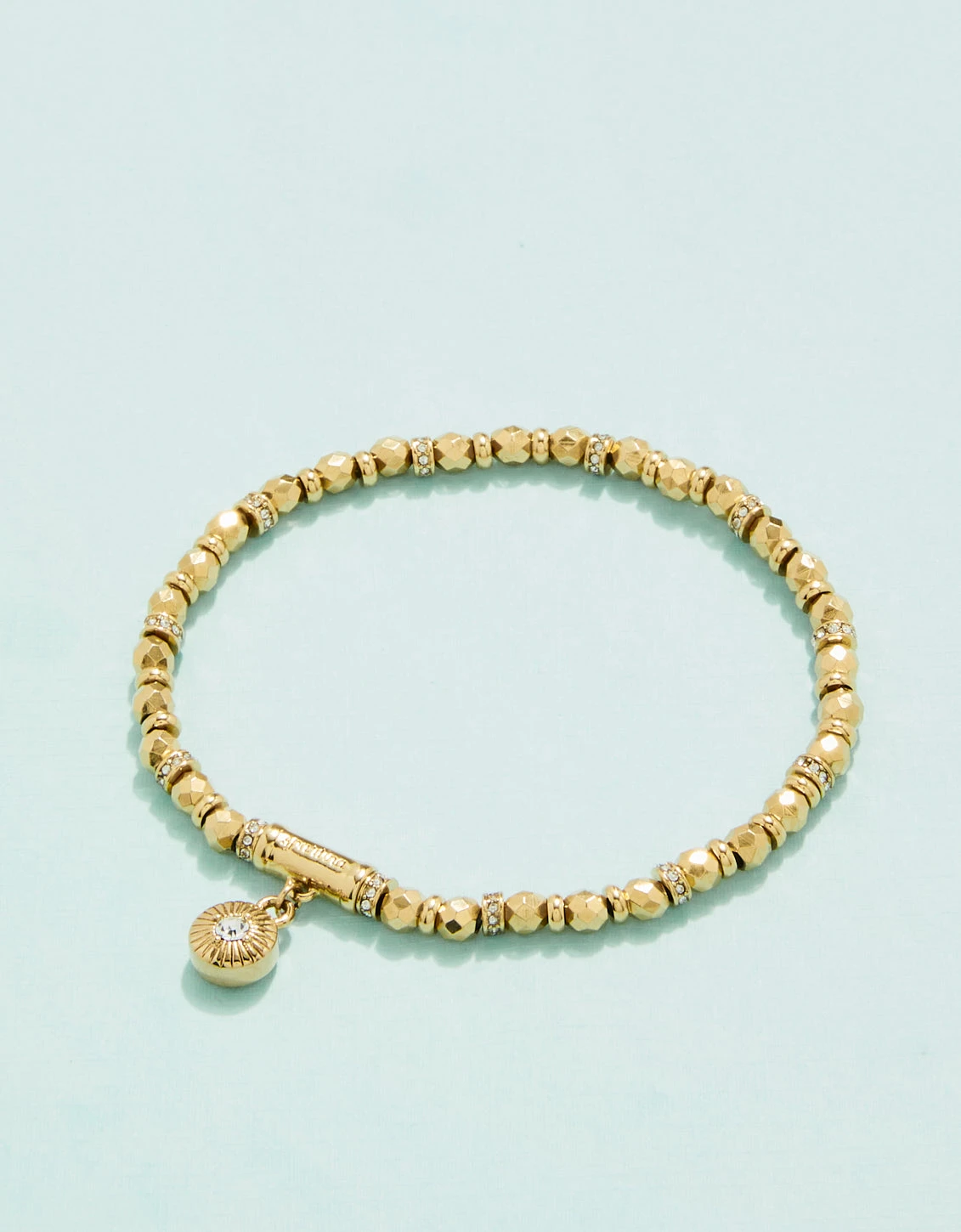 Here is a bracelet you will never have to take off! Great for stacking or mixing and matching this easy-on stretch bracelet features sparkling gems and classic gold beads. This tarnish-free, water-resistant jewelry is designed to shine through everyday wear, exercise, showers, and a summer at the beach.