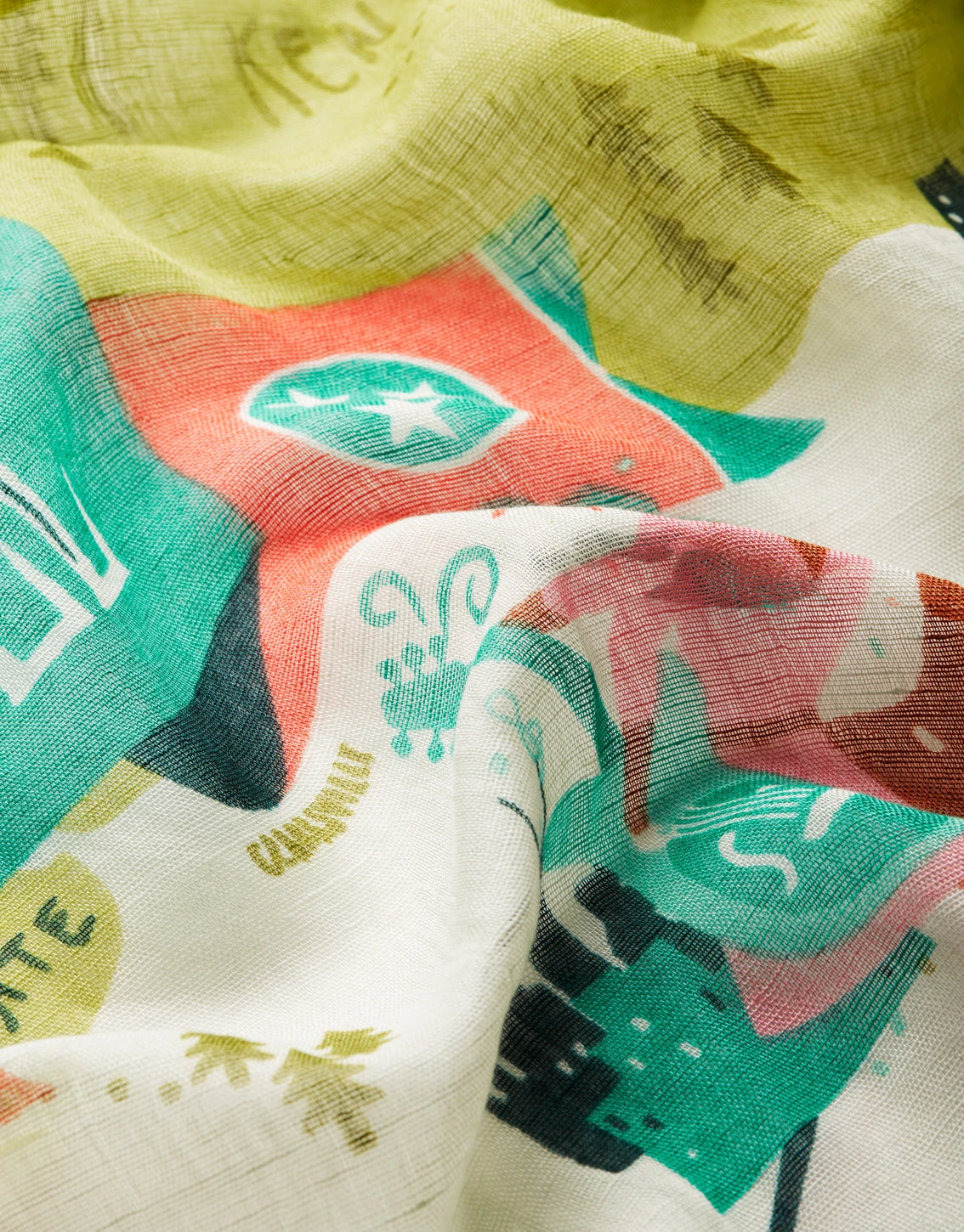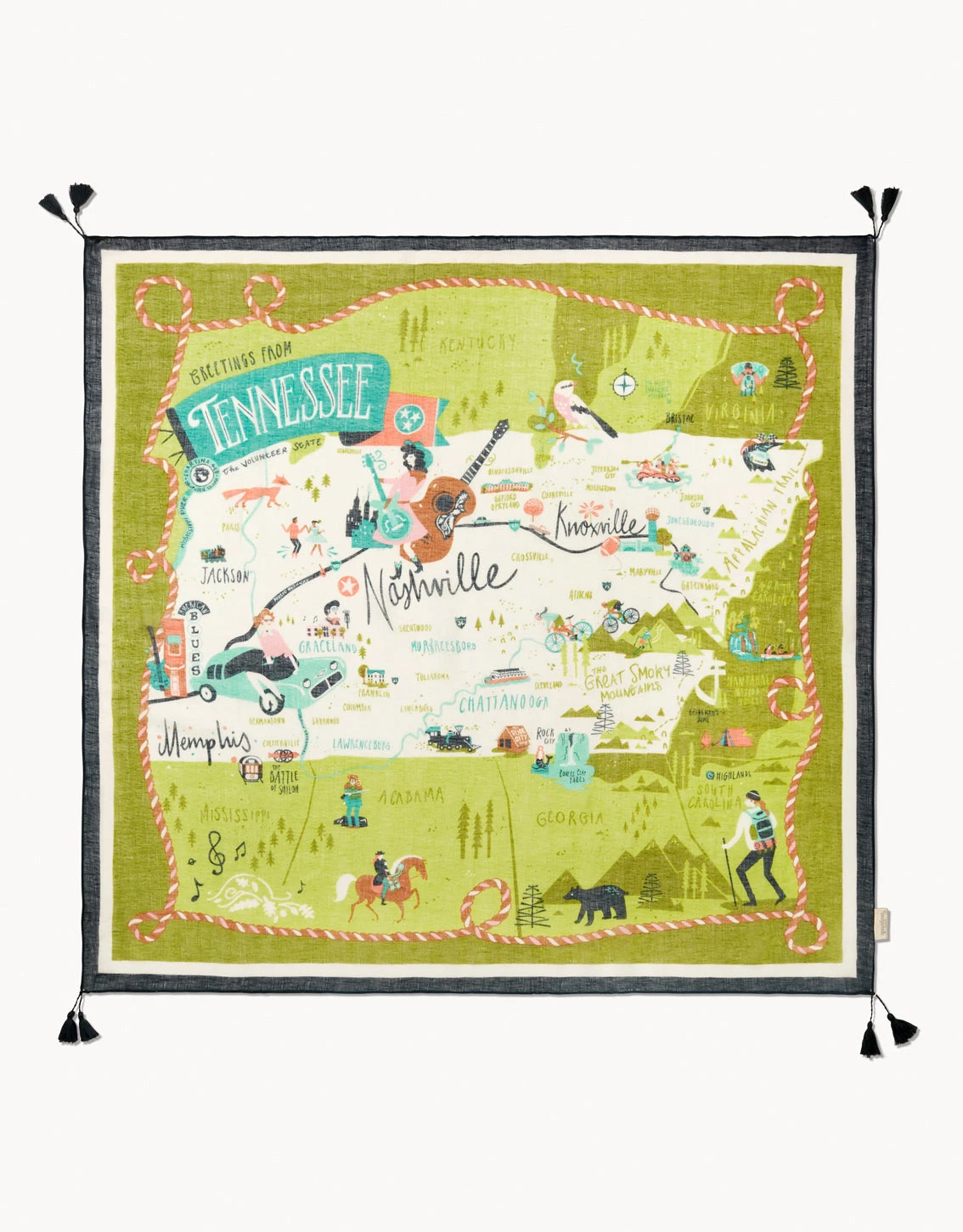 Show off your favorite local with our Greetings From Square Scarves. The super soft and light as air texture in our linen viscose blend fabric with colorful corner tassels gives you comfort and style on breezy days.