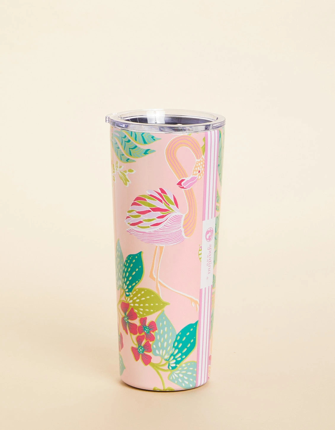 Take in the sunshine while your drink stays cool in our vacuum insulated, Stainless Steel Drink Tumbler! This 22 oz. Flamingo Pineapple patterned cup will be your best friend on beach days, pool days, work days… let’s just say every day! The clear lid features a slide closure to prevent spills and the lands softly on its rubber bottom. Keeps hot drinks hot and cold drinks cold.