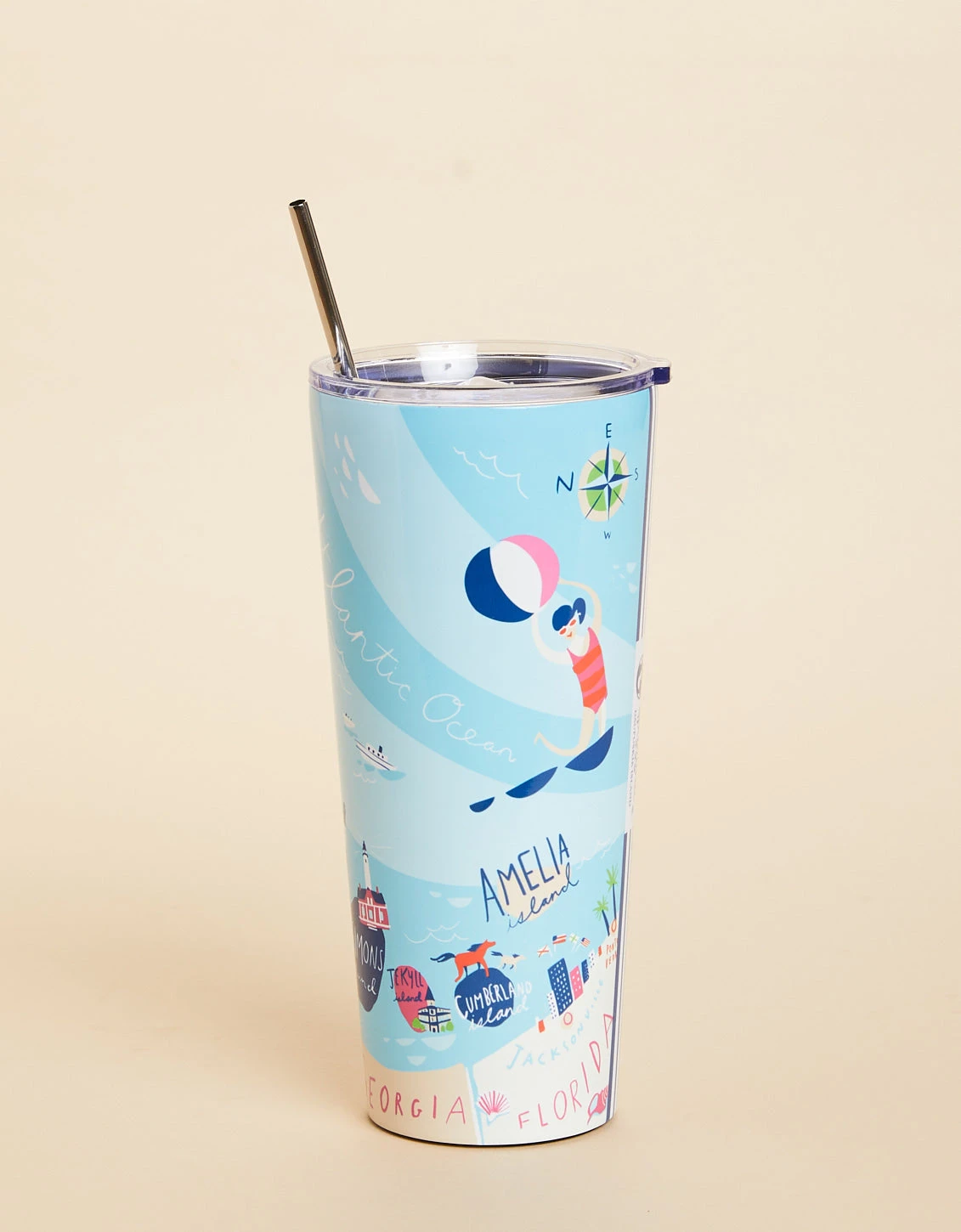 Take in the sunshine while your drink stays cool in our vacuum insulated, Stainless Steel Drink Tumbler! This 30 oz. Sea Islands illustrated map cup will be your best friend on beach days, pool days, work days… let’s just say every day! The clear lid features a slide closure to prevent spills and the lands softly on its rubber bottom. Keeps hot drinks hot and cold drinks cold.