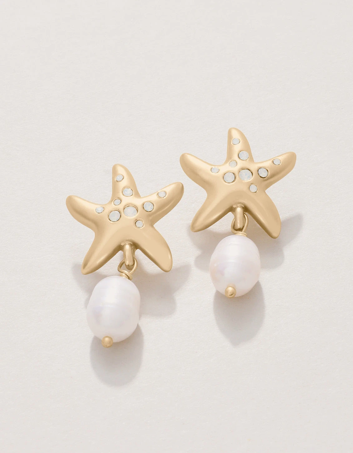 They say if you wear starfish on your ears, the starfish will give you compliments… and so will everyone else! Our Starfish Pearl Earrings feature dangling freshwater pearls and white opal studded starfish plated in 18kt matte gold.