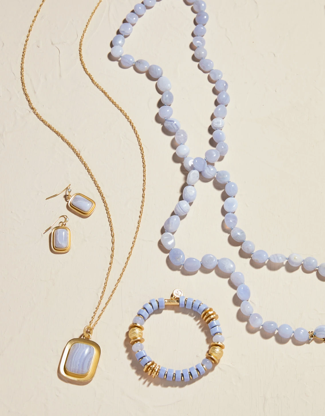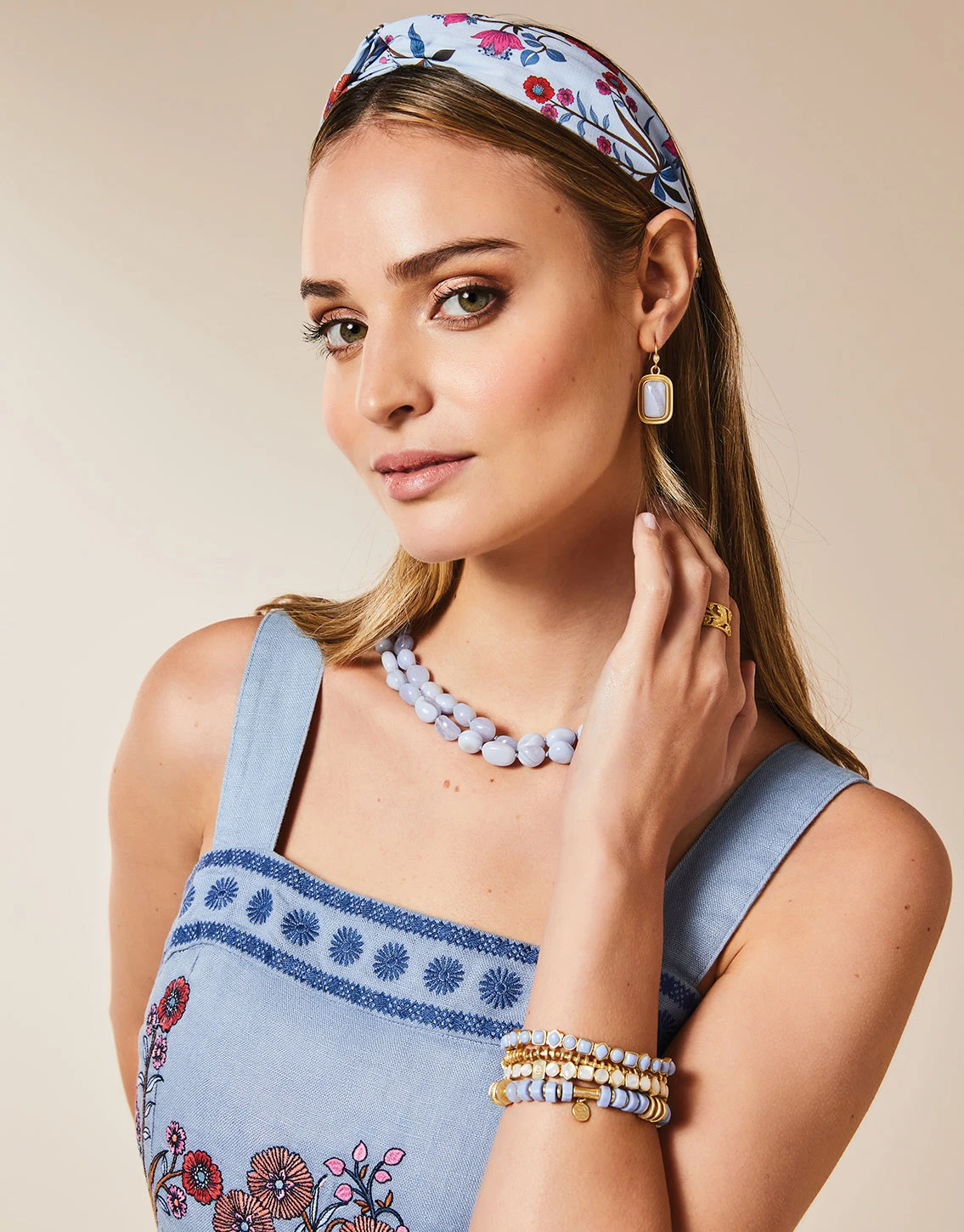 Your coastal style shines through our 8mm Stone Stretch Bracelet in Matte 18kt Gold Plating featuring natural and recycled Blue Chalcedony stone beads. Please note: This design features natural stones and each piece is one-of-a-kind. Colors and patterns may vary slightly from the image shown.