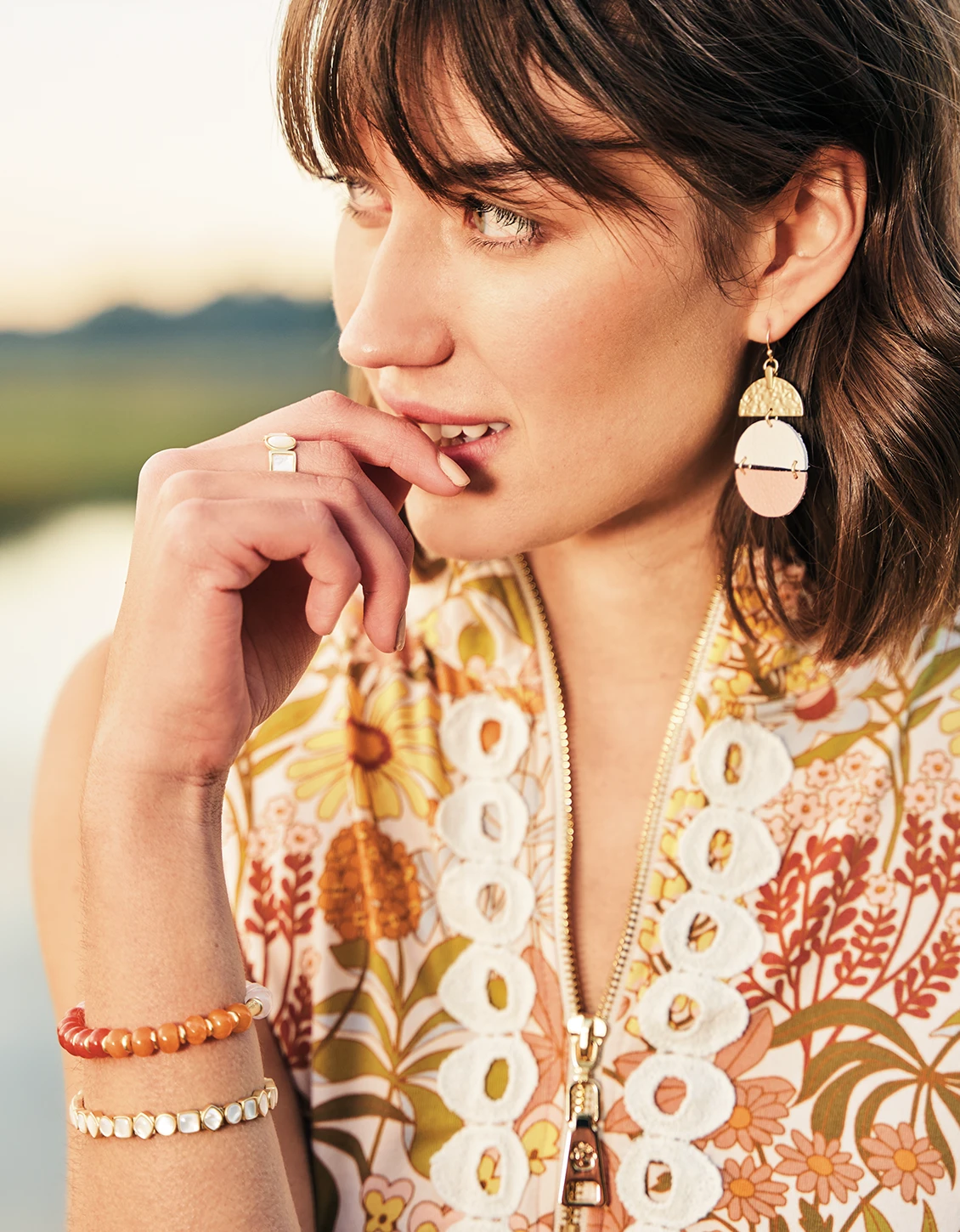 Summer fun in the sun! This 8mm Stone Stretch Bracelet is the perfect summer accessory. This bracelet features rose quartz, dyed jade and 18kt matte gold plated beads.