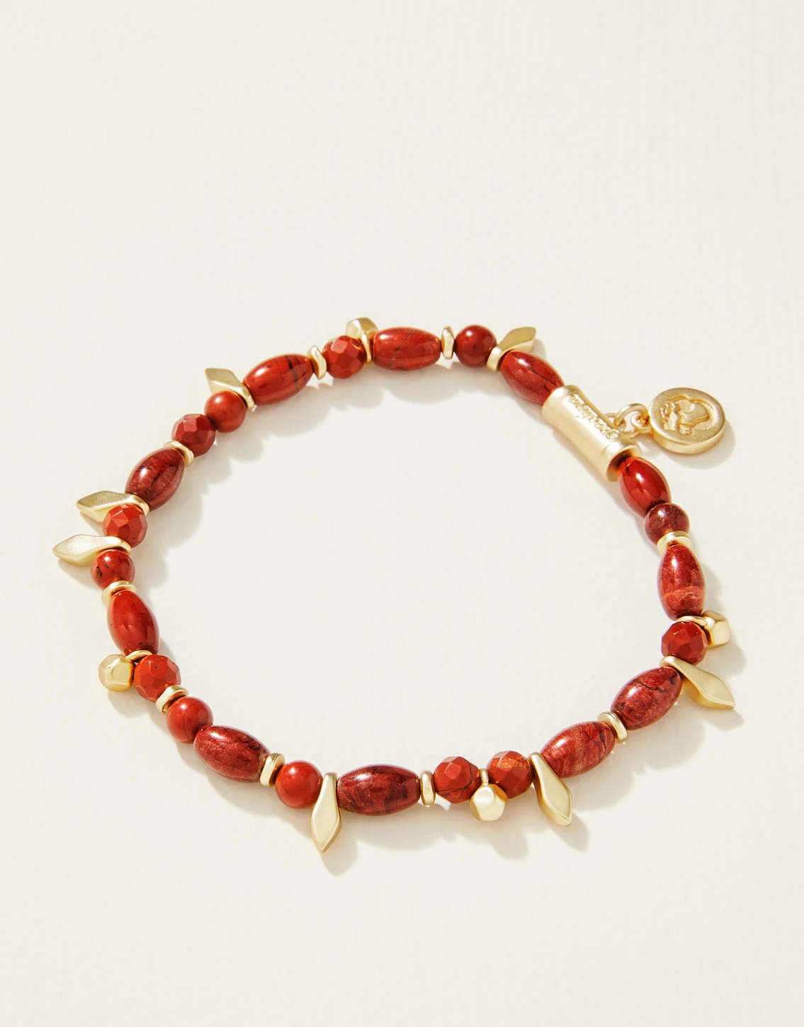 Fall into fall colors with this Red Jasper beaded Stretch Bracelet. This bracelet shines in Matte 18kt Gold Plating featuring Red Jasper natural stone beads. Please note: This design features natural stones and each piece is one-of-a-kind. Colors and patterns may vary slightly from the image shown.