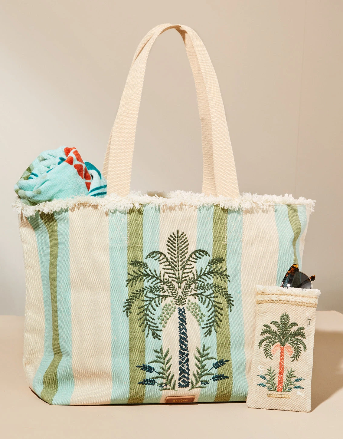 This embroidered palm tree Sunglass Case in cotton/jute with fringe and woven trim is a must-have accessory for your accessory. Easy to open and snaps shut with a magnet. Lined in faux suede this case keeps glasses safe and scratch free.