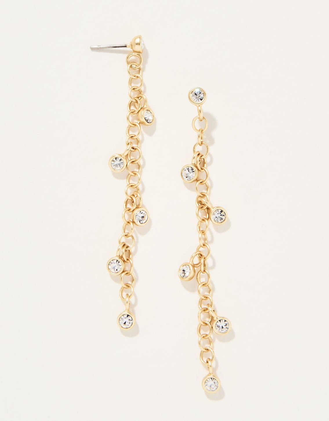 Made for holiday parties, you can dance the night away in our Swinging Chain Earrings with glass crystals set in lightweight 18kt matte gold plated settings.
