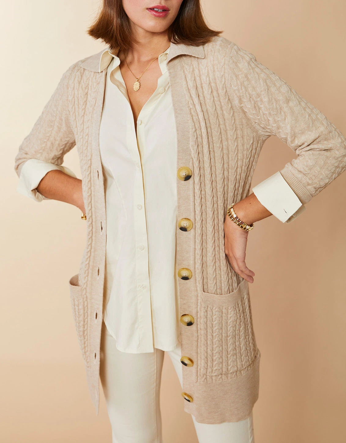 Smooth, comfortable, and luxurious, Merino wool is a soft, breathable, long natural fiber that warms in cool temperatures and cools in warm temperatures with minimal pilling. Our cable knit Toni Long Cardigan features a collared neck, ribbed long sleeves, ribbed hem, deep front patch pockets, and a center front summary closure. Layer over our Sienna Blouse and cinch with a belt for added style.