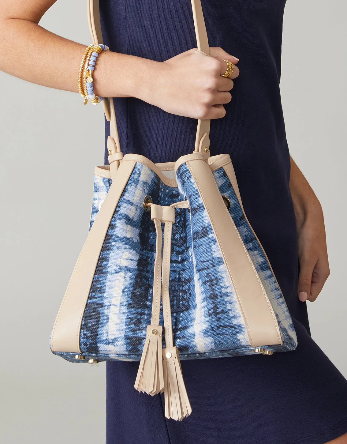 This delightfully chic drawstring bag is cinch with its Napa leather tassel cord and adjustable crossbody strap. It delivers style and efficiency, thanks to interior pockets to keep essentials well-organized for on-the-go days and off-the-clock nights.