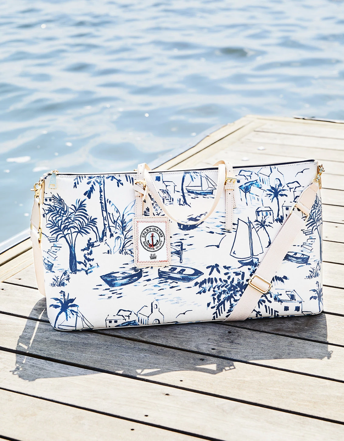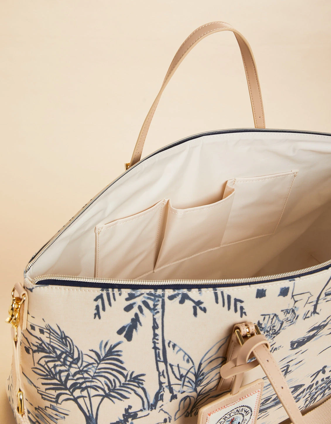 If you have jetset mindset like we do, then you need our Voyager Duffle. This zip-top is made with our signature linen and accented with our embroidered nautical logo fob. Easily carry through TSA by the faux leather handles or wear by the webbed, adjustable and detachable crossbody strap to keep things moving. The ample interior holds it all, while the convenient trolley sleeve quickly slips over the handle on your roller luggage. Made with an easy-to-wipe-clean, splash-proof, stain-resistant, laminated linen and cotton.