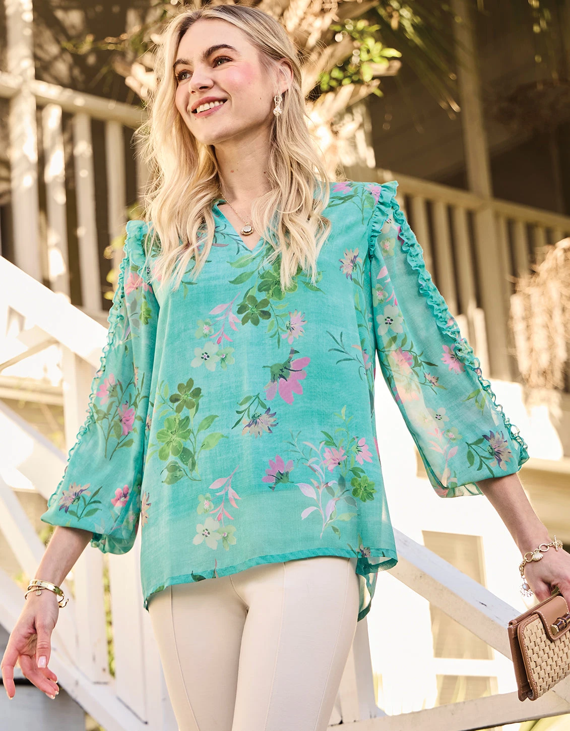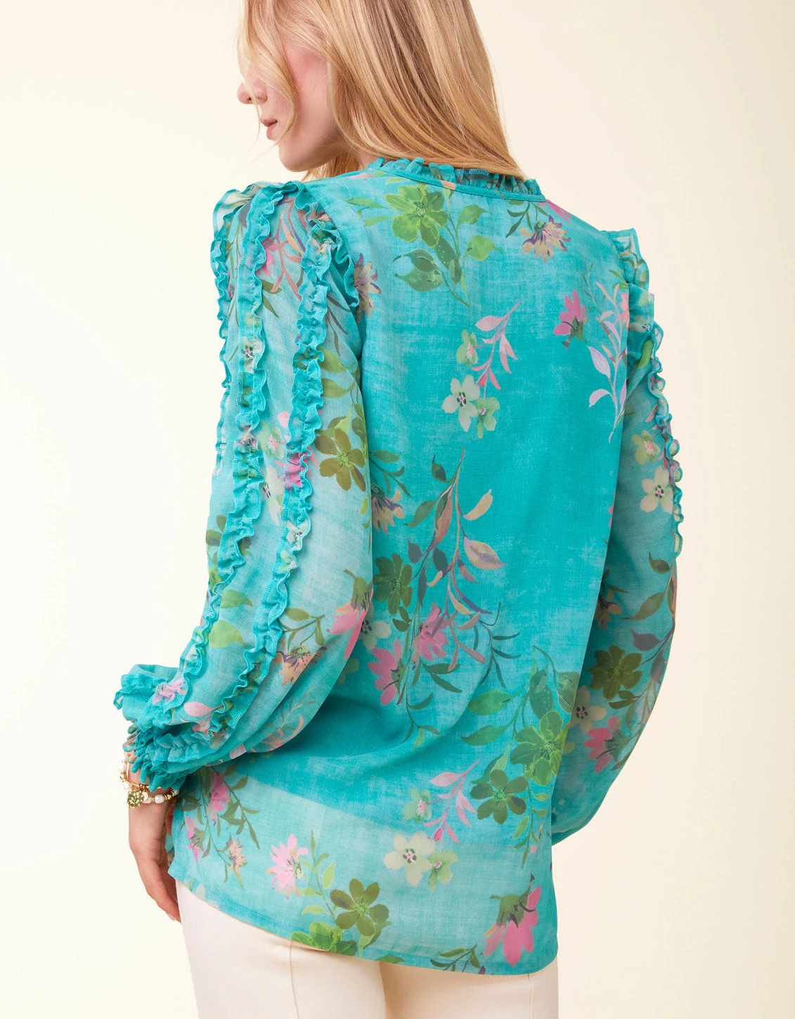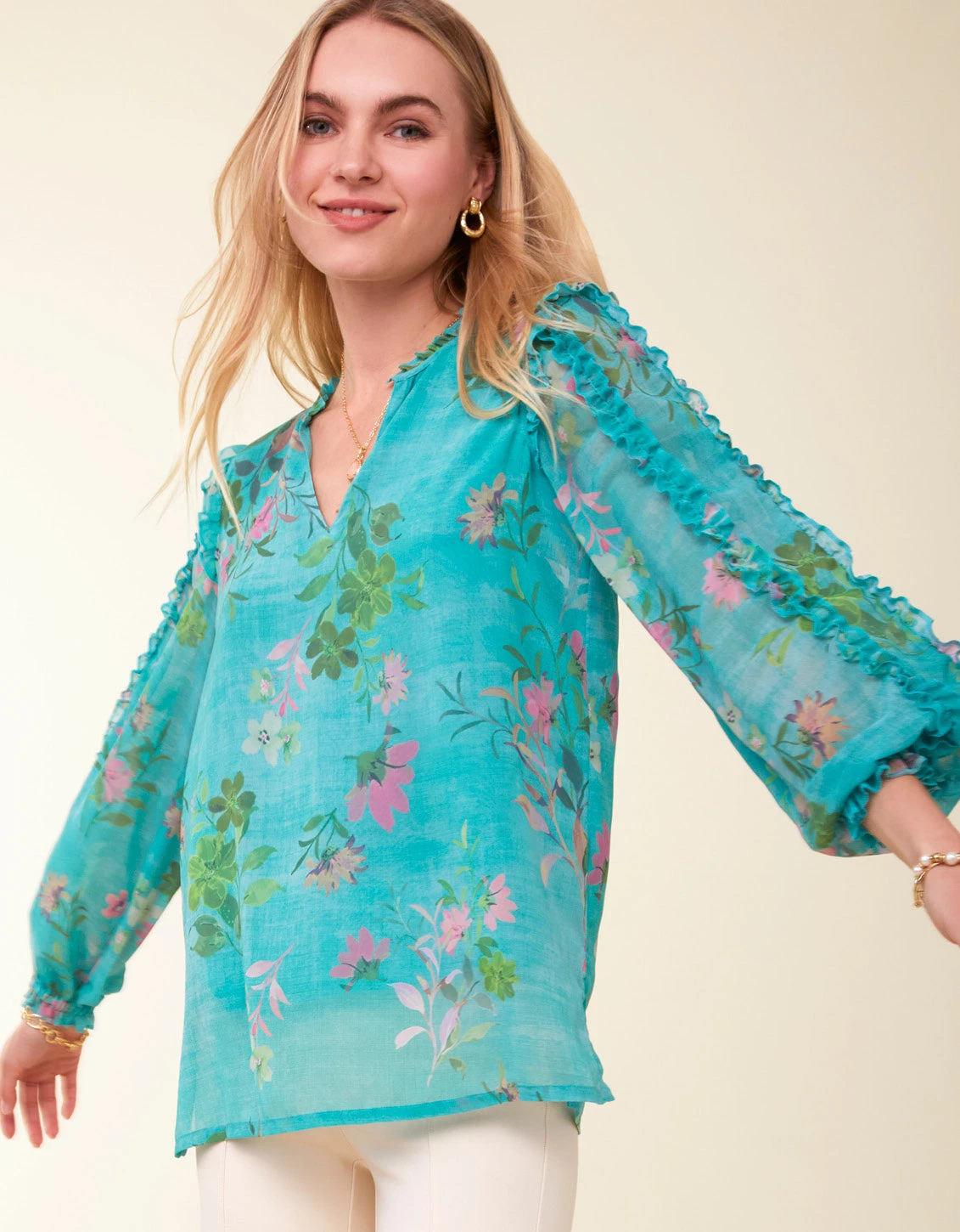 The season for florals and ruffles has arrived and our Wilenna Blouse delivers. Wilenna has it all: long, ruffle detailed sleeves, and a split, ruffle neckline.